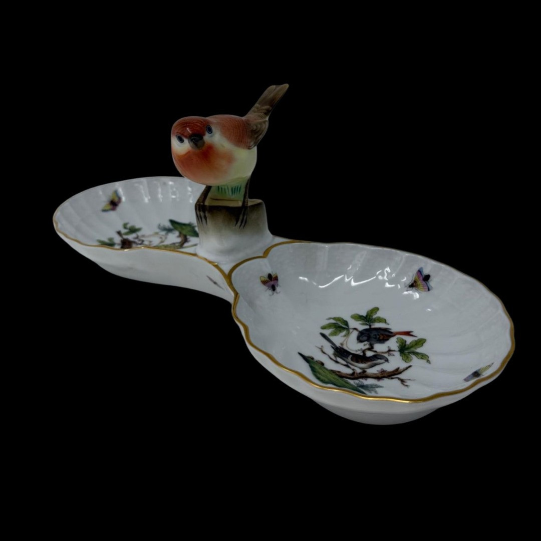 Lot # 8 - Herend Rothschild Porcelain 2-Section Nut Dish with Bird Handle