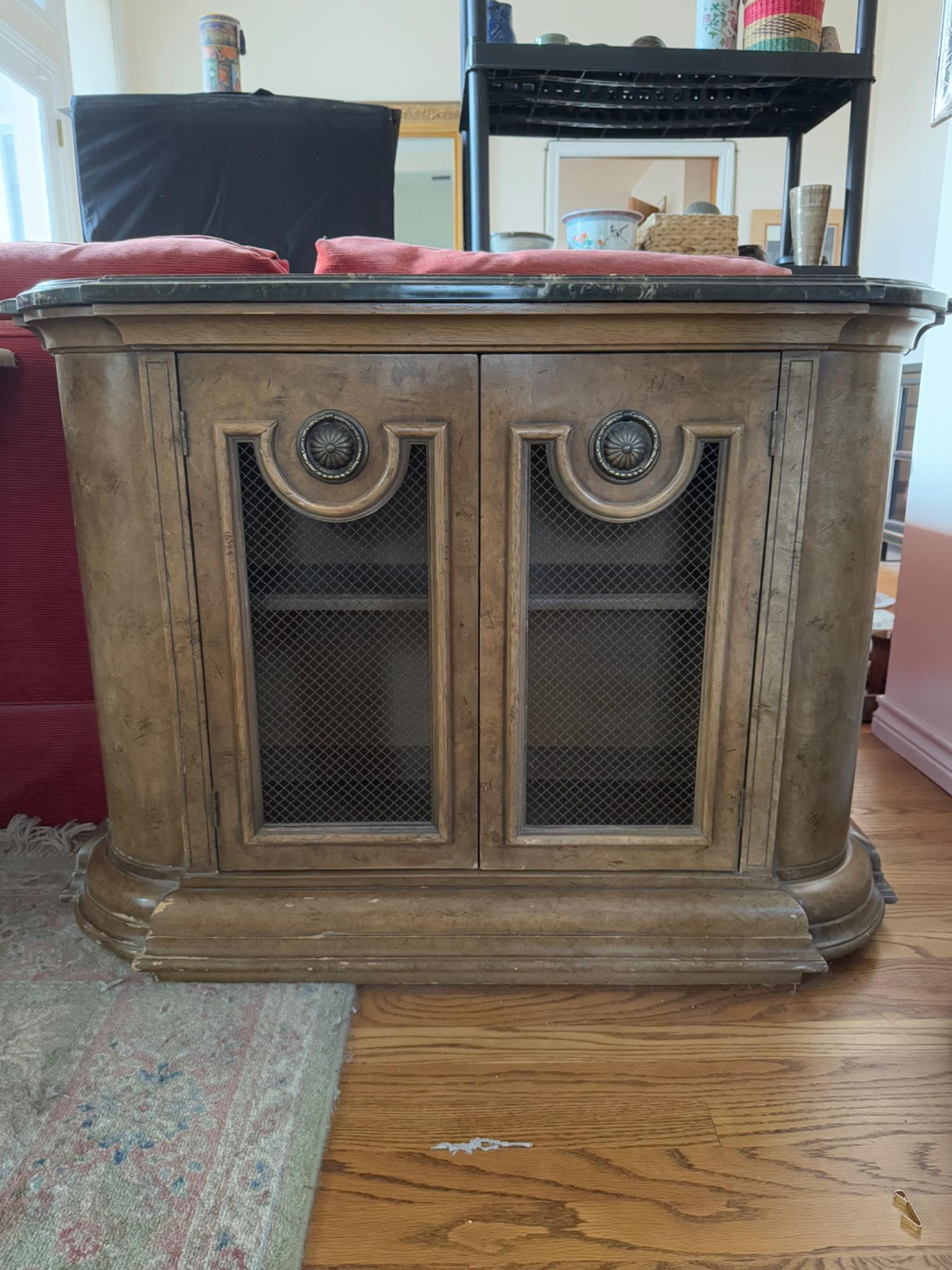 This is a vintage-style wooden cabinet with a traditional, classical design. It has a curved front and a dark marble or faux-marble top that contrasts with the warm brown wood finish. The cabinet features two front doors with decorative mesh panels, framed with ornate molding and topped with circular rosette accents, giving it a refined and slightly antique look. The base of the cabinet has a thick, molded pedestal that adds to its sturdy and elegant appearance. The piece is likely made from solid wood or veneer, with a slightly distressed finish that suggests either age or intentional antiquing.
