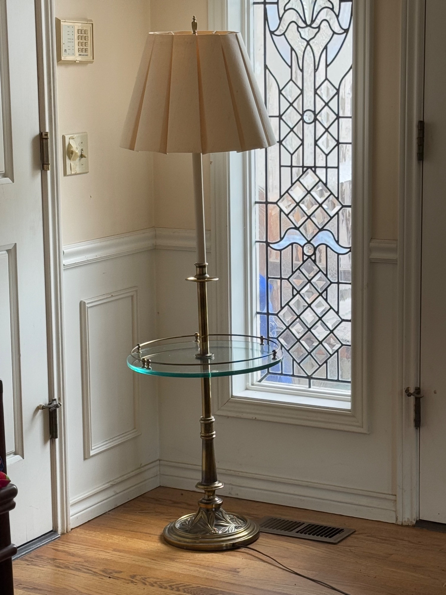 round glass shelf and is topped with a petaled cream shade. The lamp's sturdy