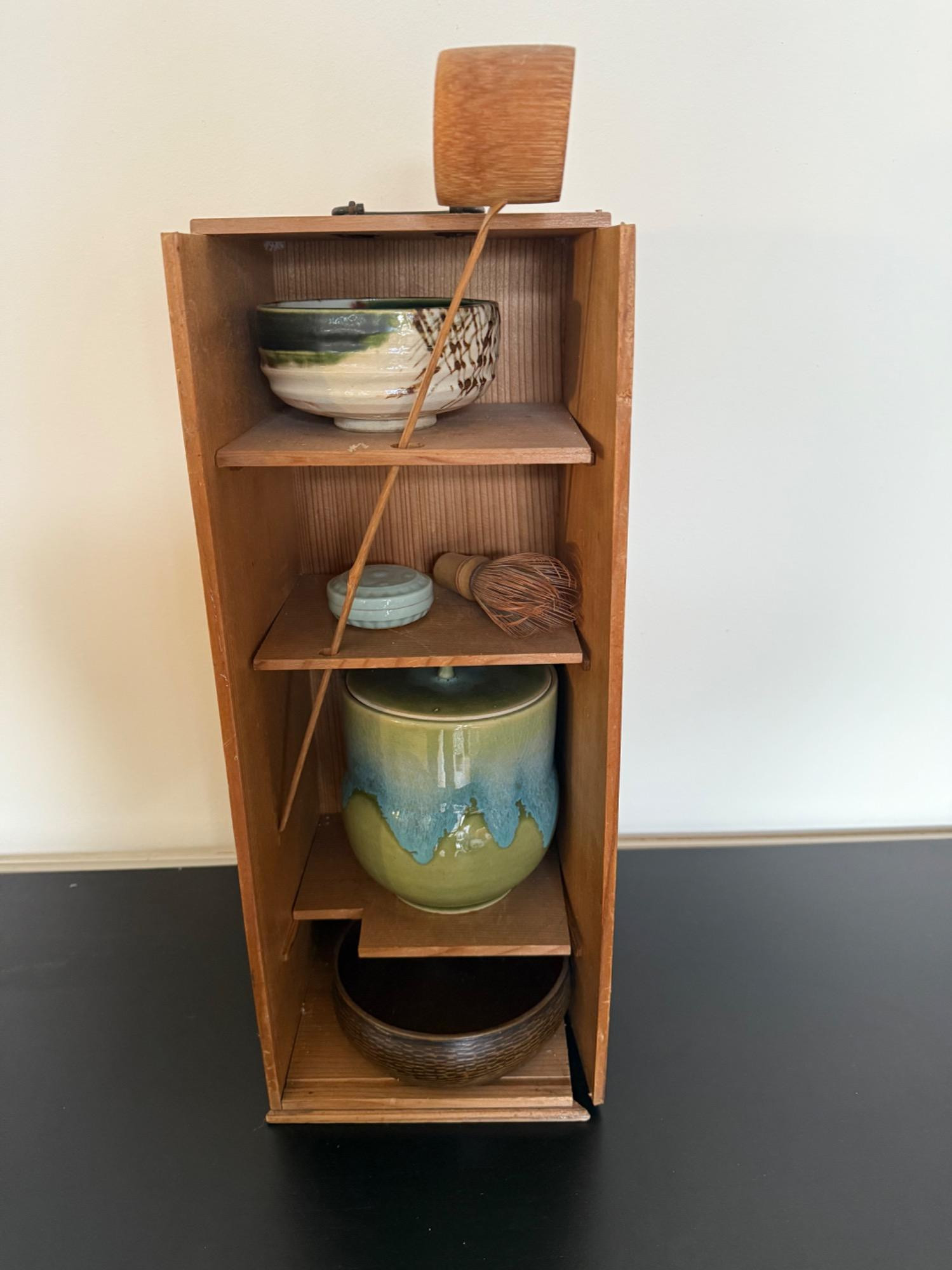 Tool Box Set with Green/Blue Pottery" This Japanese tea ceremony tool box set