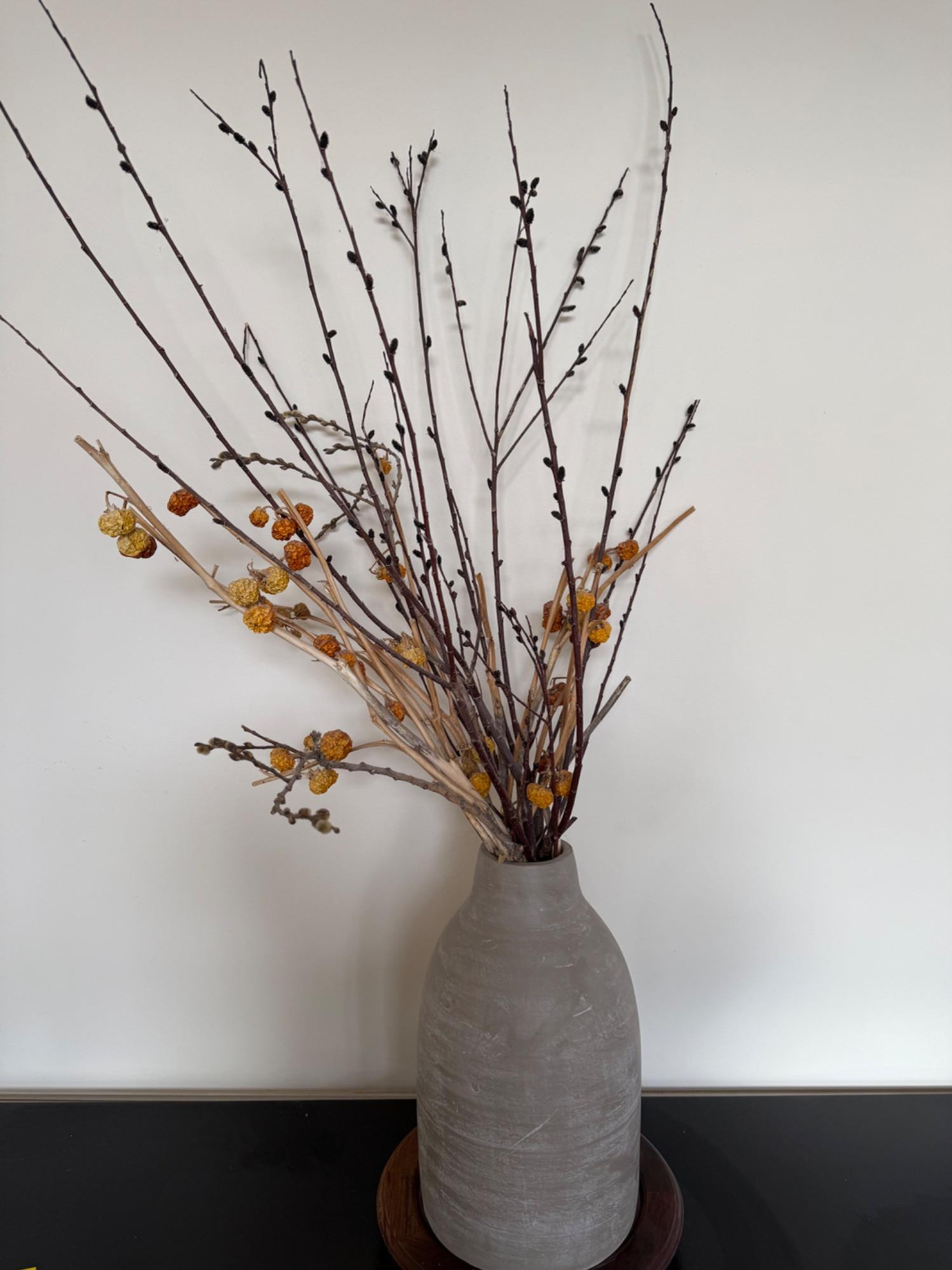branches arranged on a sturdy wood stand. The vase and branches create a