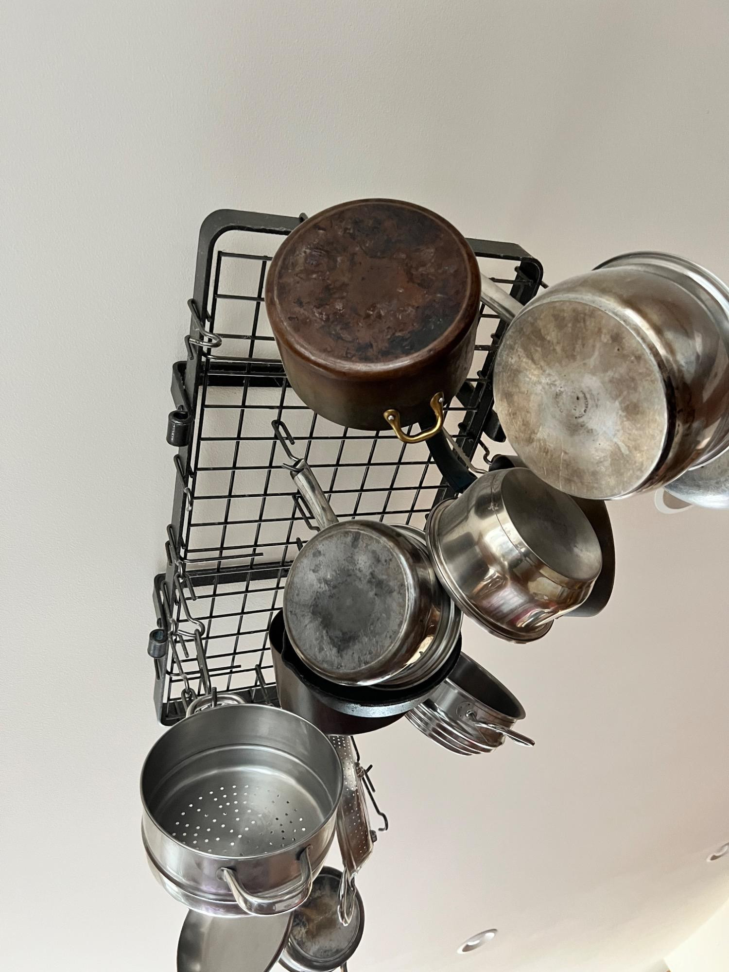 sturdy grid shelf with multiple hooks, allowing you to hang pots, pans, and