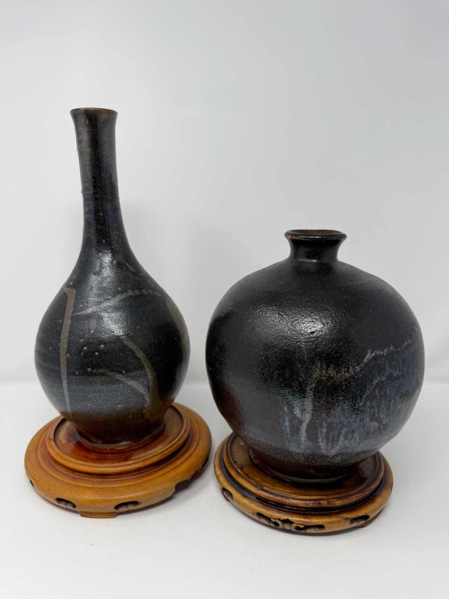 Pair of handcrafted ceramic vases showcases the elegance of traditional pottery techniques with a modern, minimalist aesthetic. Both vases feature a rich, dark glaze with organic, flowing patterns of lighter tones, adding depth and character. 12' x 5" Taller 9" x 7" Shorter Vases are glued to bases, did not try to remove.