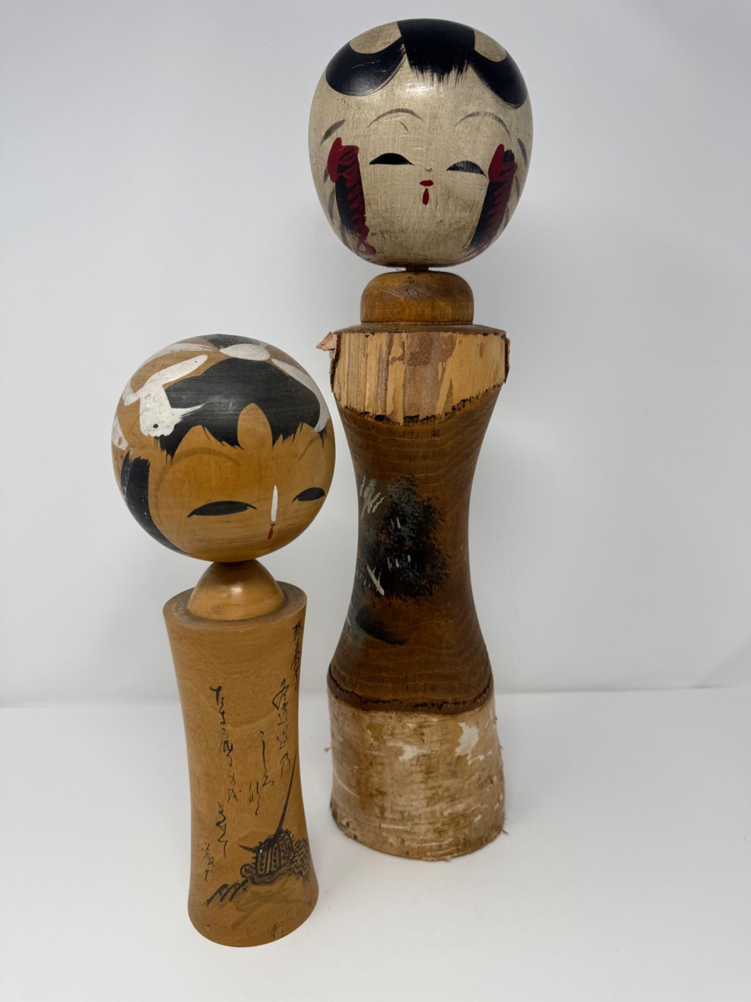 Two vintage Japanese Kokeshi dolls, beautifully hand-carved and hand-painted. These traditional wooden dolls showcase intricate craftsmanship and distinct designs. Both dolls show signs of wear consistent with age, adding to their vintage charm. A red maker’s stamp is visible on the base of one doll, indicating its authenticity.