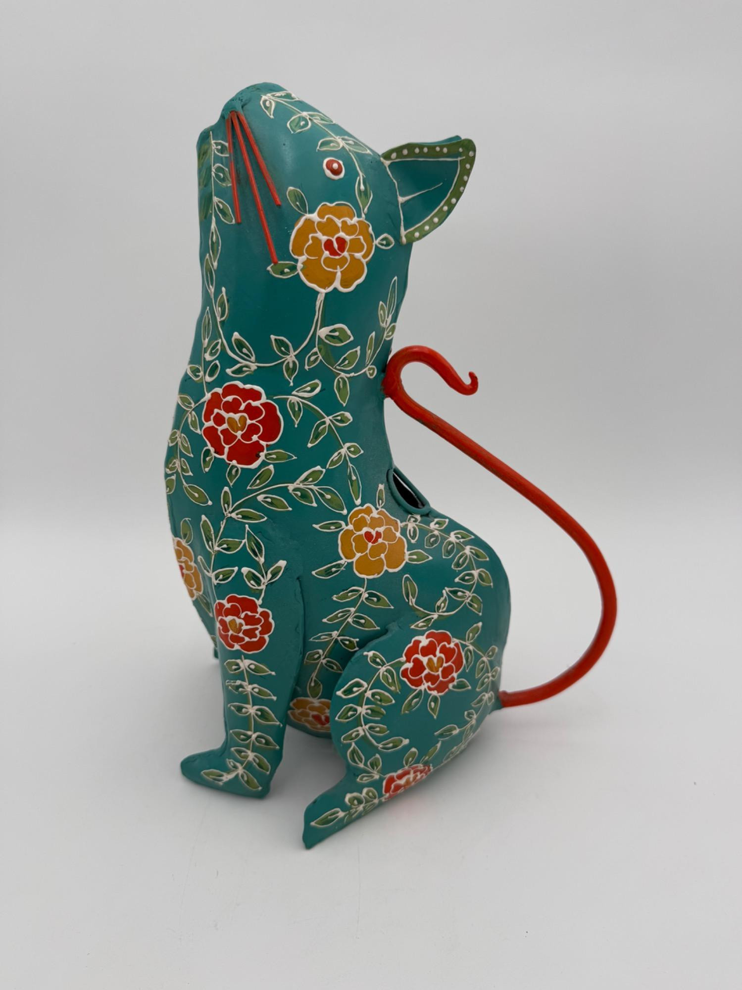 Hand-Painted Metal Floral Cat Watering Can This unique decorative piece features an elegant teal body adorned with detailed floral patterns in red, orange, and white. The striking red tail and whiskers add a whimsical touch, making it a standout addition to any space.