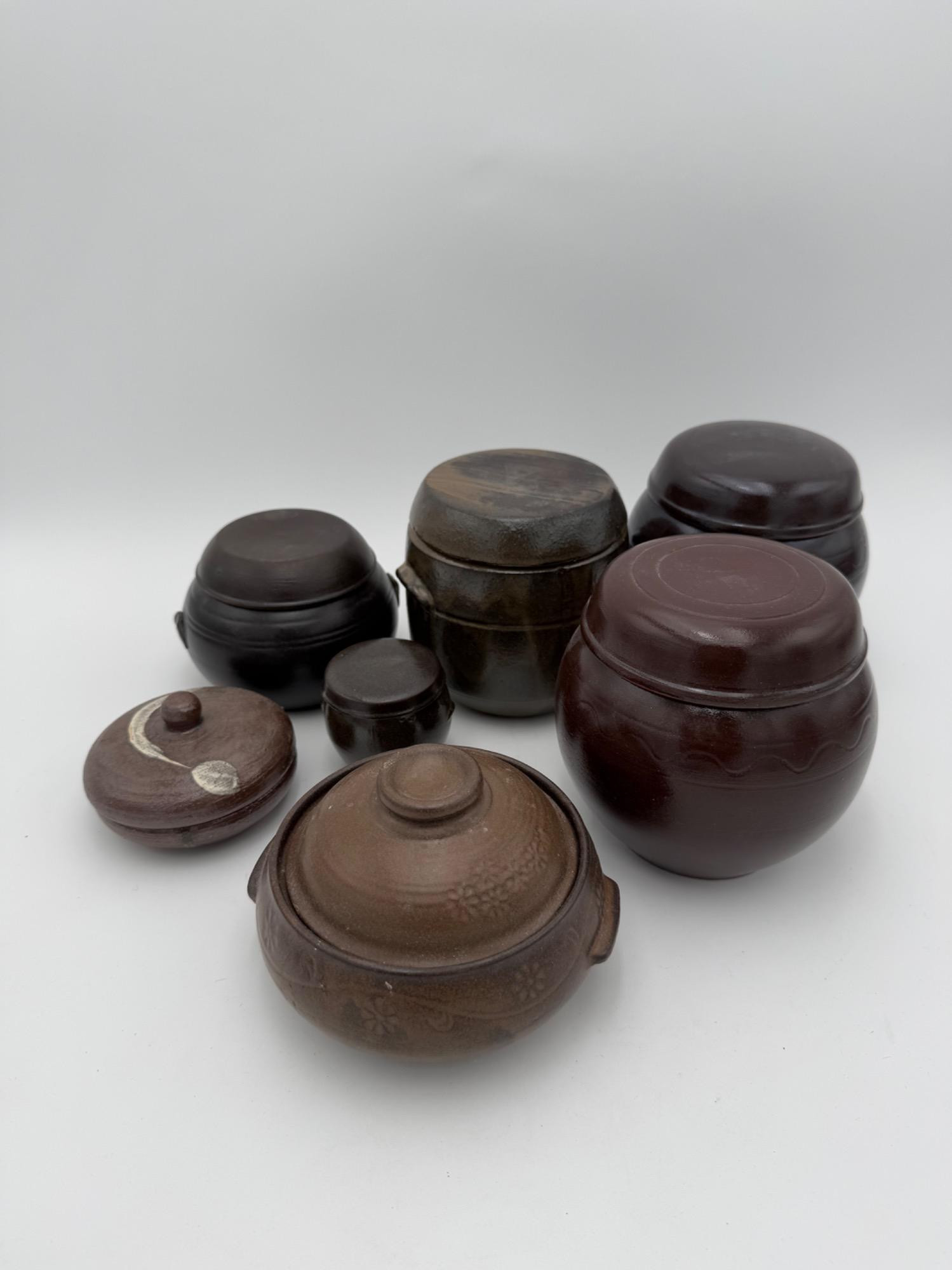 A unique collection of vintage Korean Onggi-style earthenware jars. These handcrafted pottery pieces, traditionally used for fermenting and storing food, showcase a variety of rich brown and earthy tones with distinctive textures and finishes. Some jars feature subtle decorative elements, such as engraved patterns and hand-painted motifs, while others retain their raw, rustic appeal. The set includes lidded and open-top designs, varying in size and shape, making them excellent for display, storage, or collectors of traditional Korean ceramics. Their natural, unglazed surfaces highlight the craftsmanship of time-honored pottery techniques.