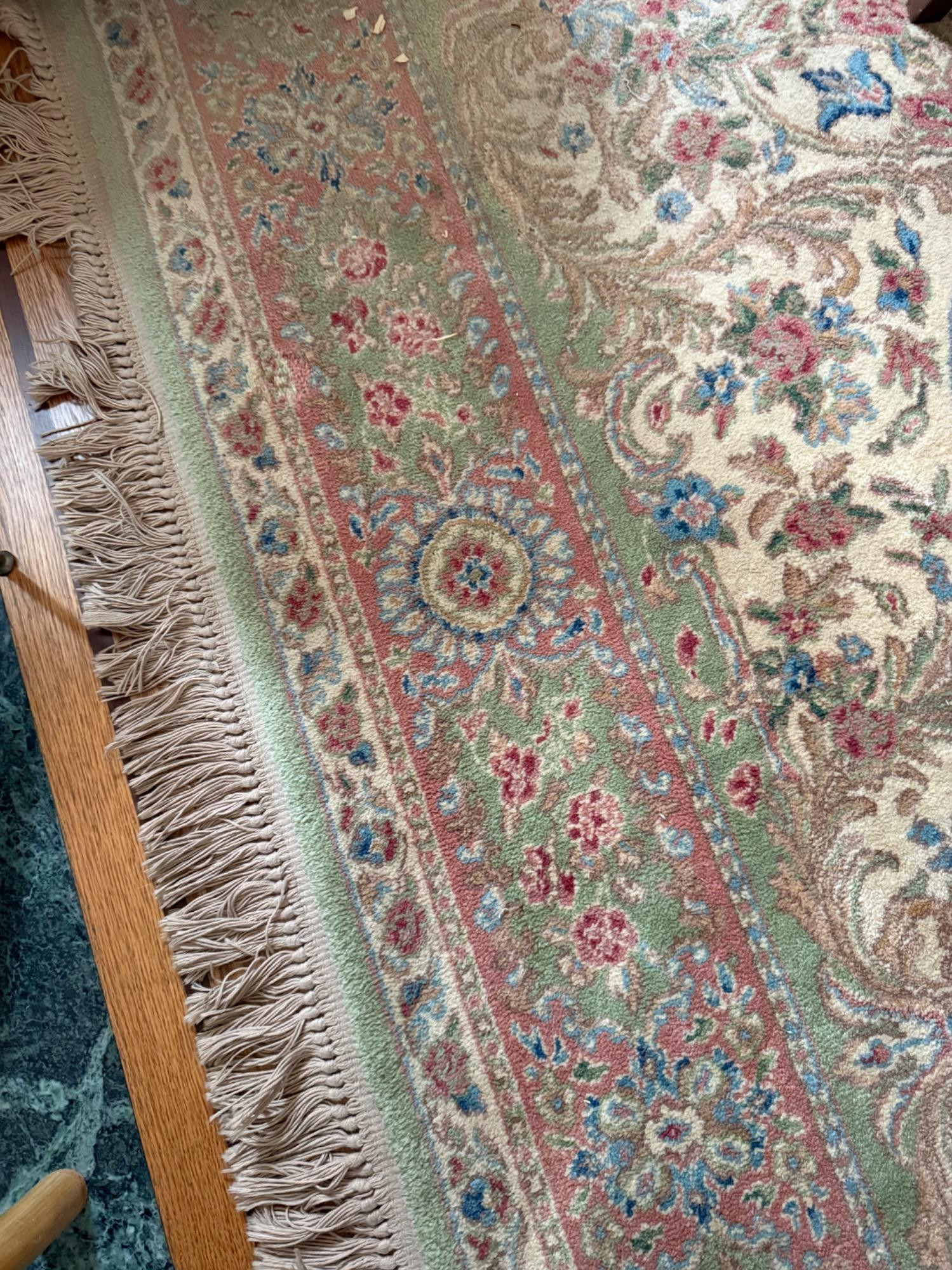 This is a traditional area rug with intricate floral patterns and a classic color palette. Possibly a Kerastan rug but unable to see a label due to inability to lift rug. Karastan is well known for producing high-quality machine-made rugs that mimic traditional Persian and Oriental designs. Based on the colors, floral motifs, and intricate borders, it is possible that this rug is a Karastan Persian-style design. Here are the key details: Some fading and areas that show wear and soiling. Dimensions 103.5 inches by 148 inches plus a 3 inch fray on longer side.
