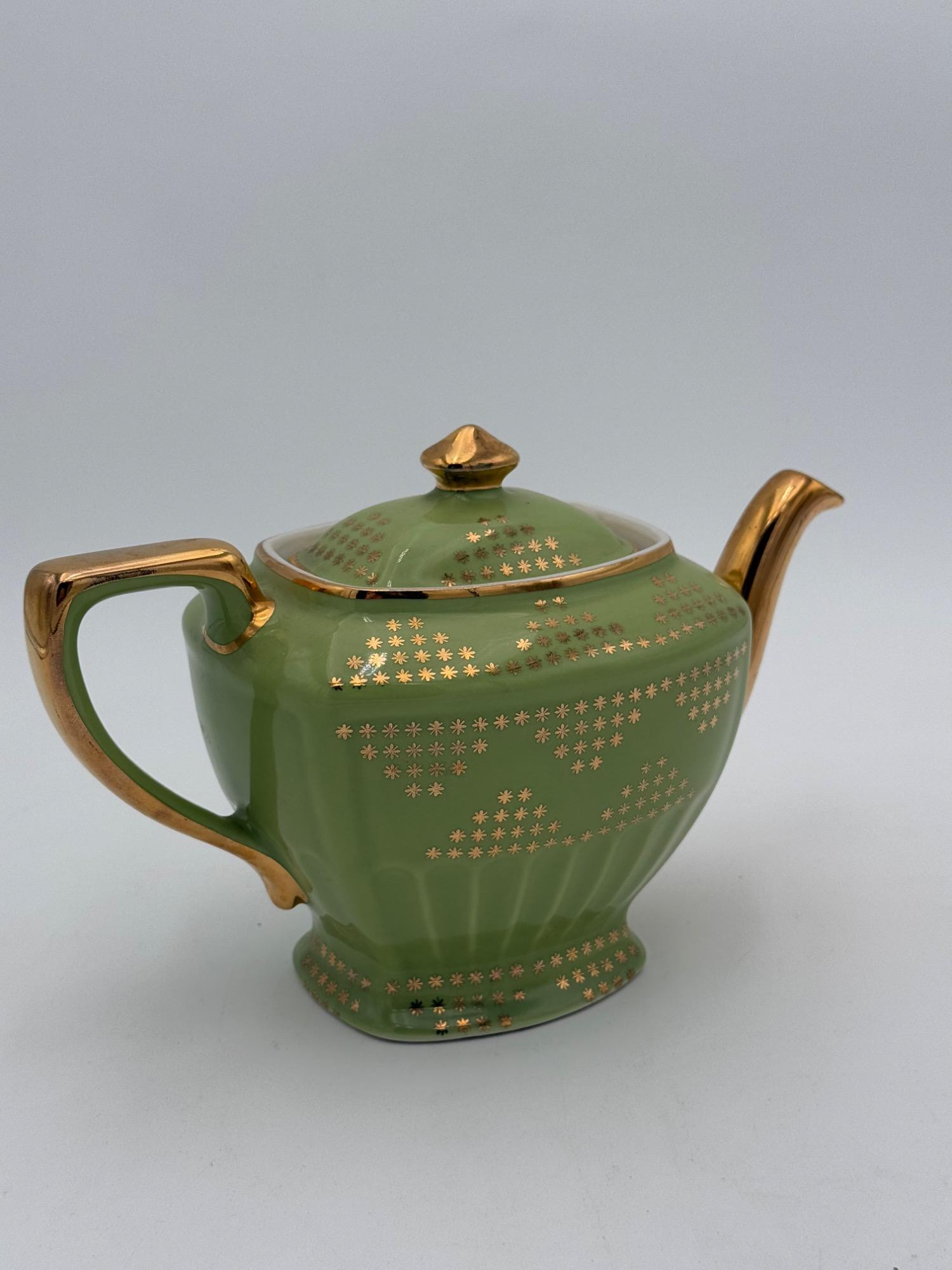 Vintage Hall Pottery teapot, featuring a rich green glaze with intricate gold detailing. The teapot showcases Hall’s signature Art Deco-inspired design, with a fluted body, elegant curves, and a scalloped base. The gold-accented handle, spout, and finial enhance its luxurious appeal.