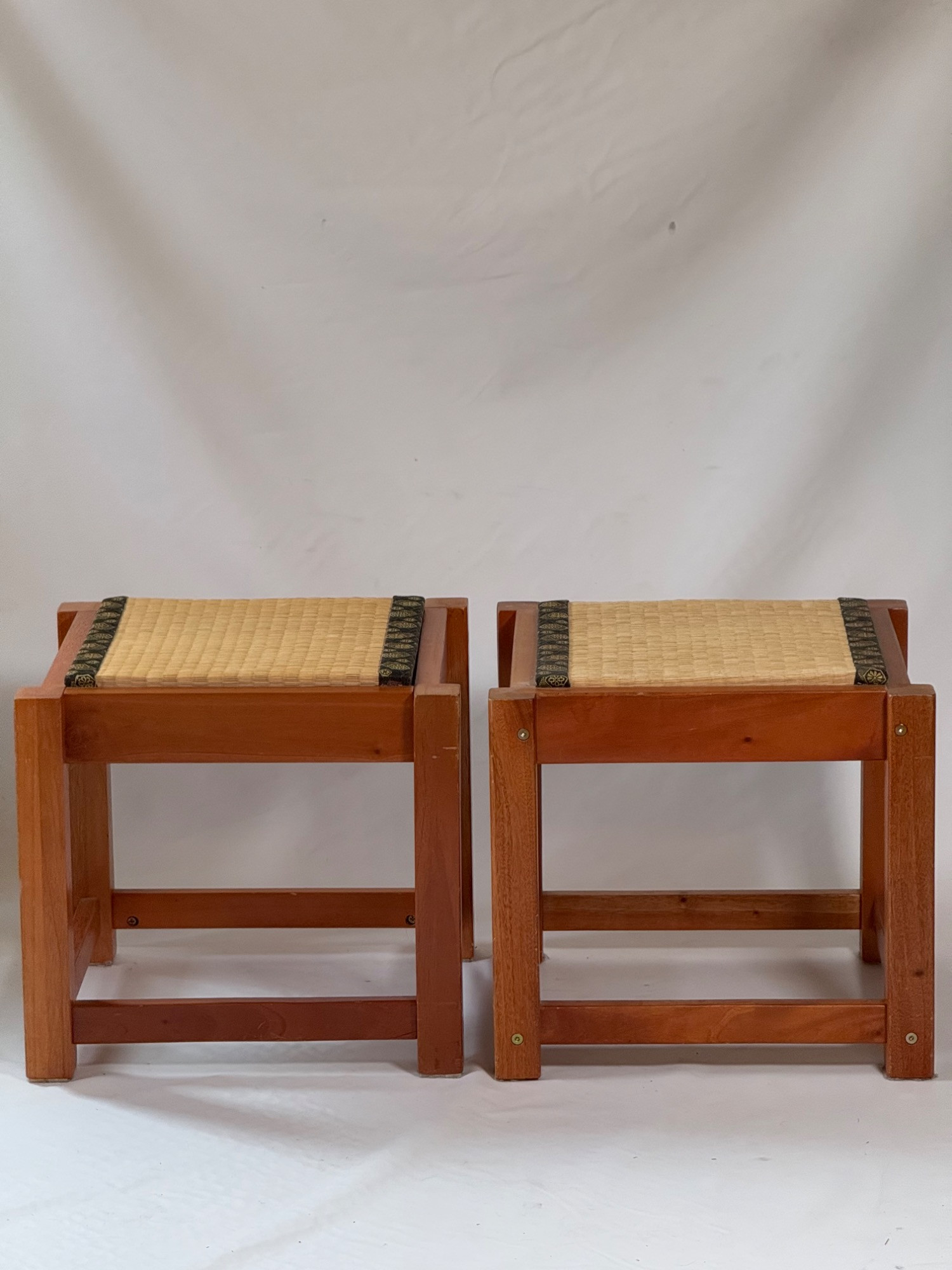 This beautiful set of 4 Tatami stools showcases traditional Japanese craftsmanship with a solid wood frame and woven rush Tatami seat. The minimalist design highlights the natural beauty of the wood, complemented by decorative black fabric trim along the edges of the Tatami. 15" seat height 16.5" Width