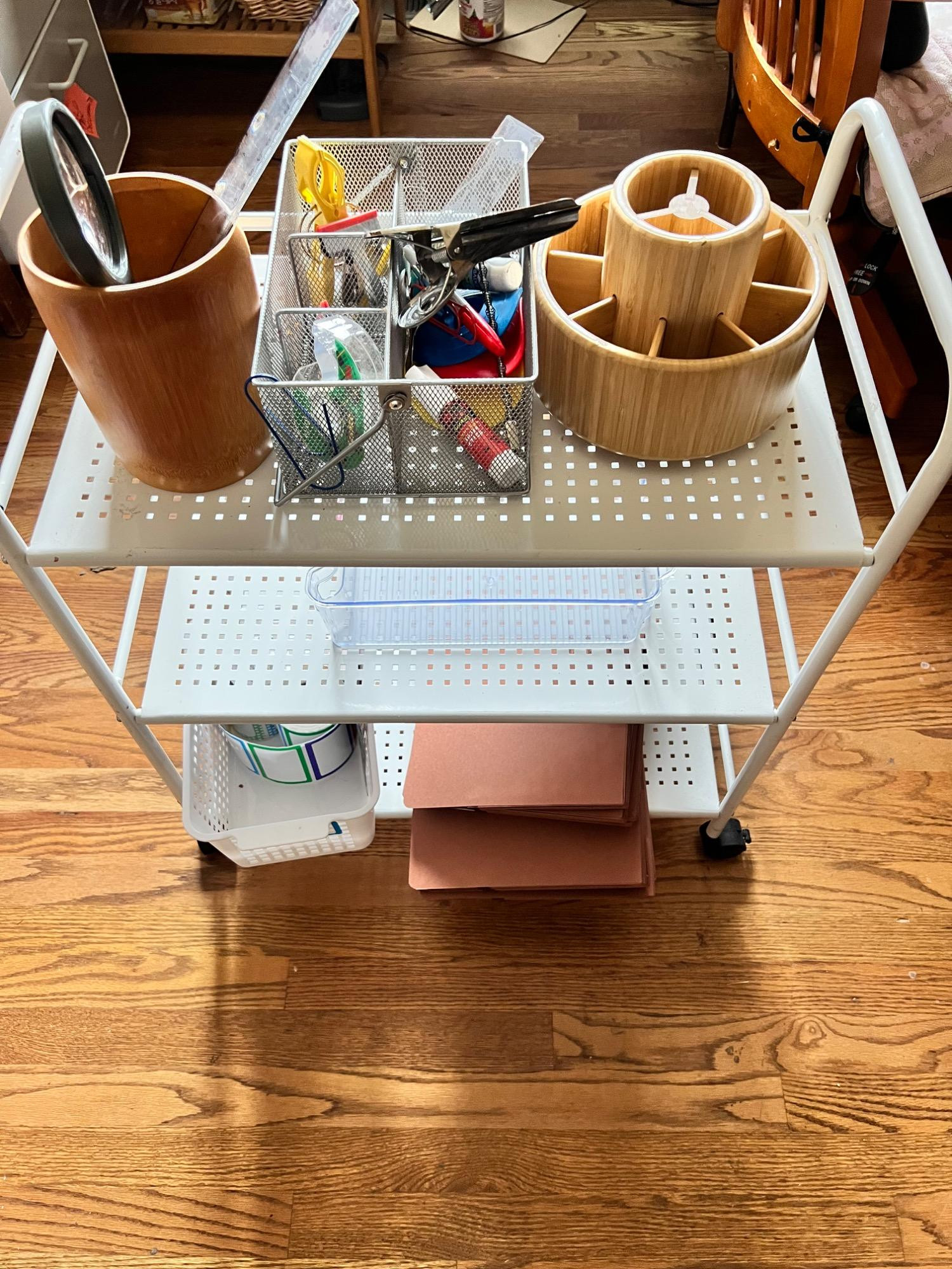 This versatile white rolling office supply cart features a sturdy metal frame with three perforated shelves for ventilation and organization. Ideal for home offices, studios, or classrooms, it provides ample storage for supplies, paperwork, and tools. Items on cart are included.
