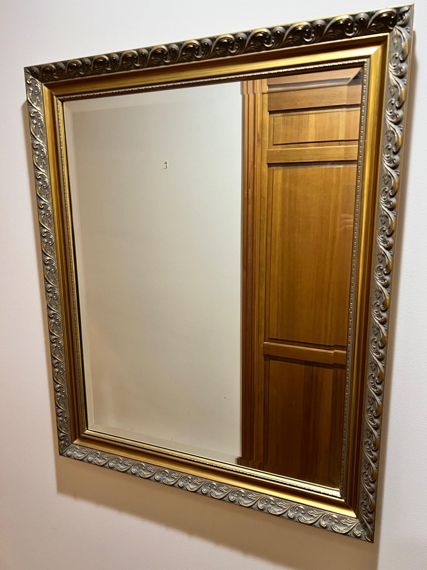 This beautiful rectangular wall mirror features an ornate gold and silver-tone frame with intricate scroll detailing. The classic design makes it a perfect addition to traditional, vintage, or French-inspired décor. Features: