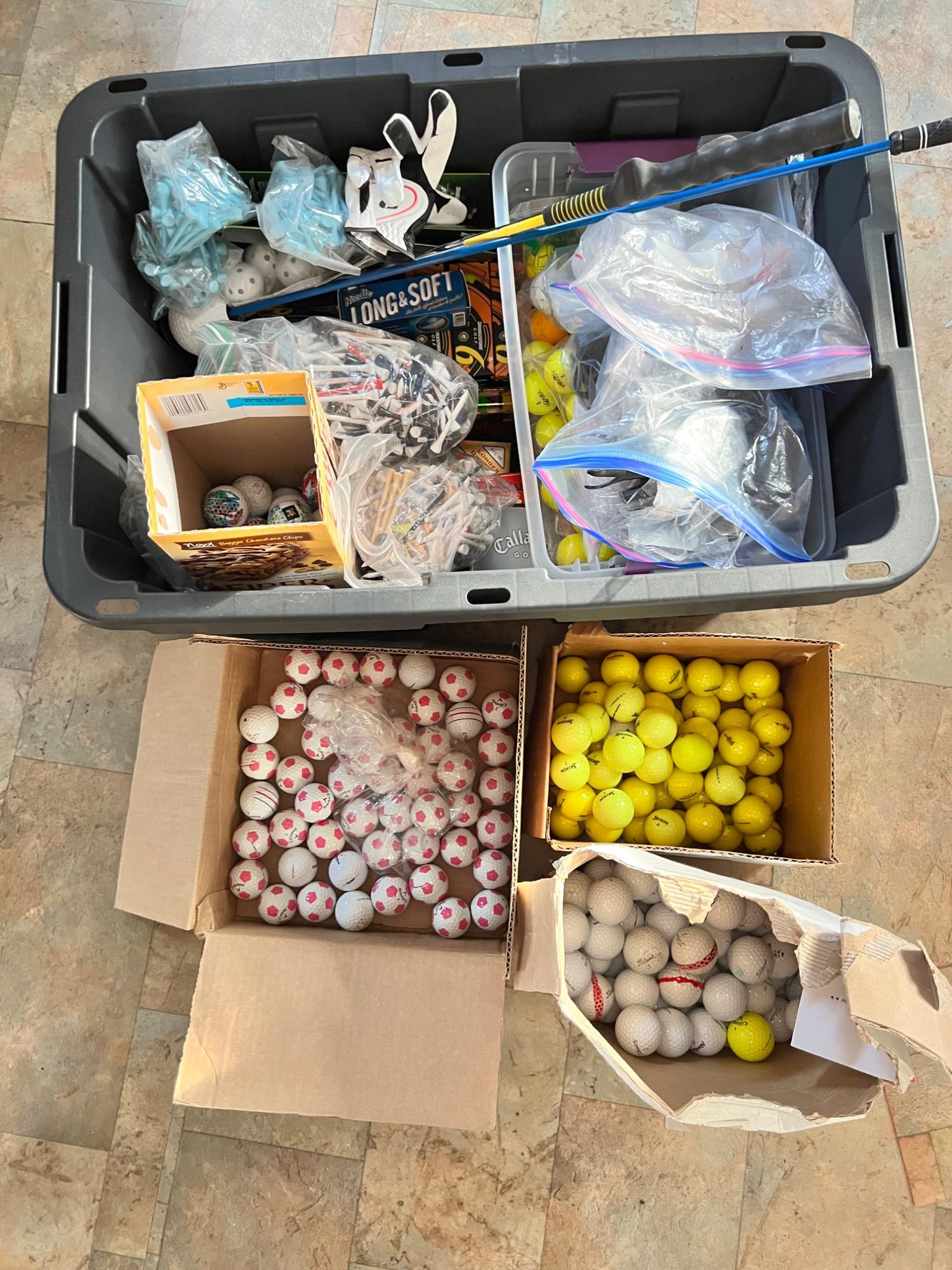 Assortment of golfing items. Balls, tees, practice clubs, divot tools, golf gloves and other golf related items.