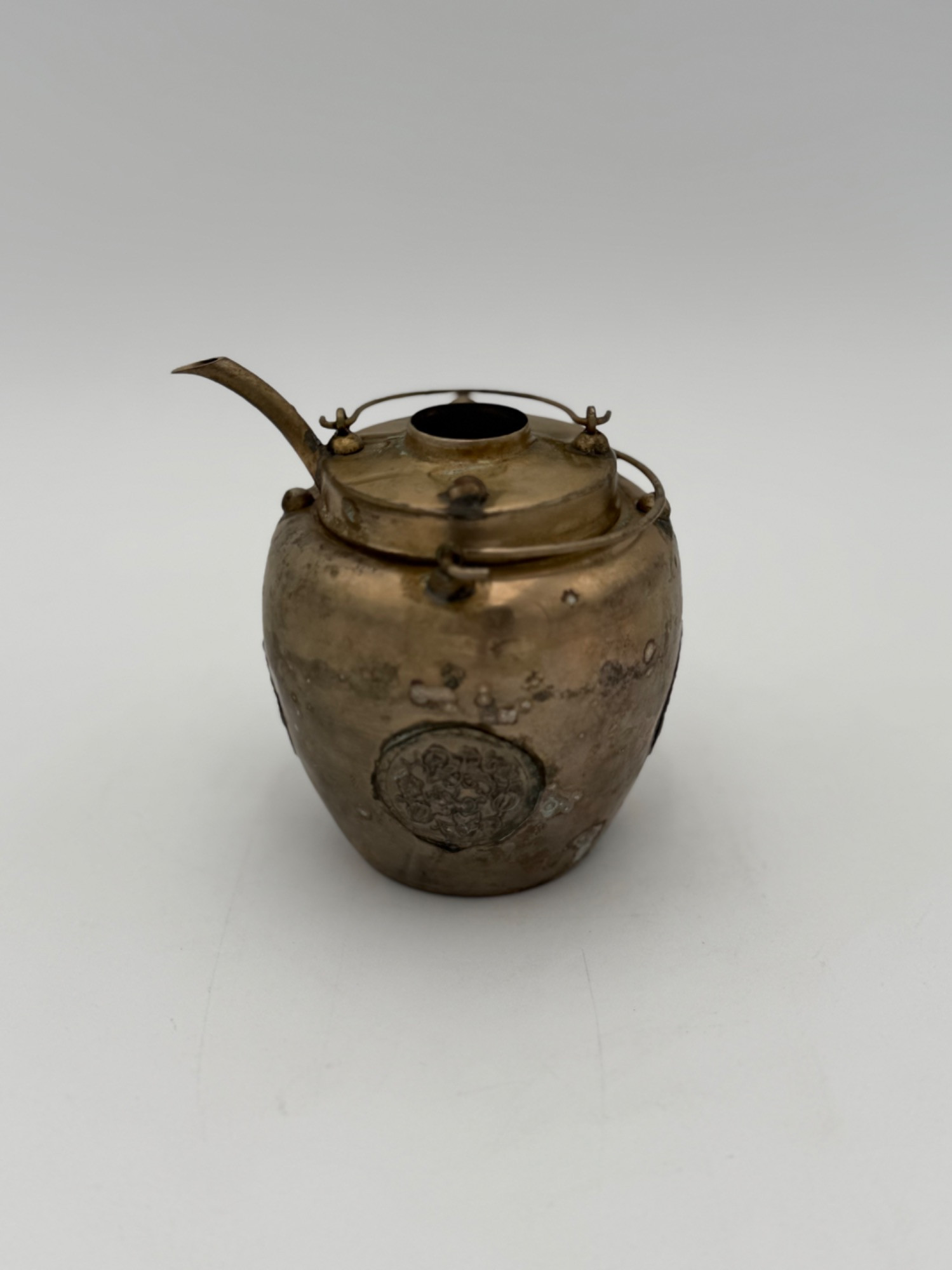 An intriguing antique brass teapot, possibly of Chinese origin, featuring embossed circular medallions with floral and symbolic motifs. The vessel has a beautifully aged patina with oxidation and surface wear, indicating its significant age. The spout extends gracefully from the rounded body, while the lid is secured by a hinged metal frame with small decorative knobs. The craftsmanship and design suggest it may have been used for ceremonial purposes or as a decorative piece.