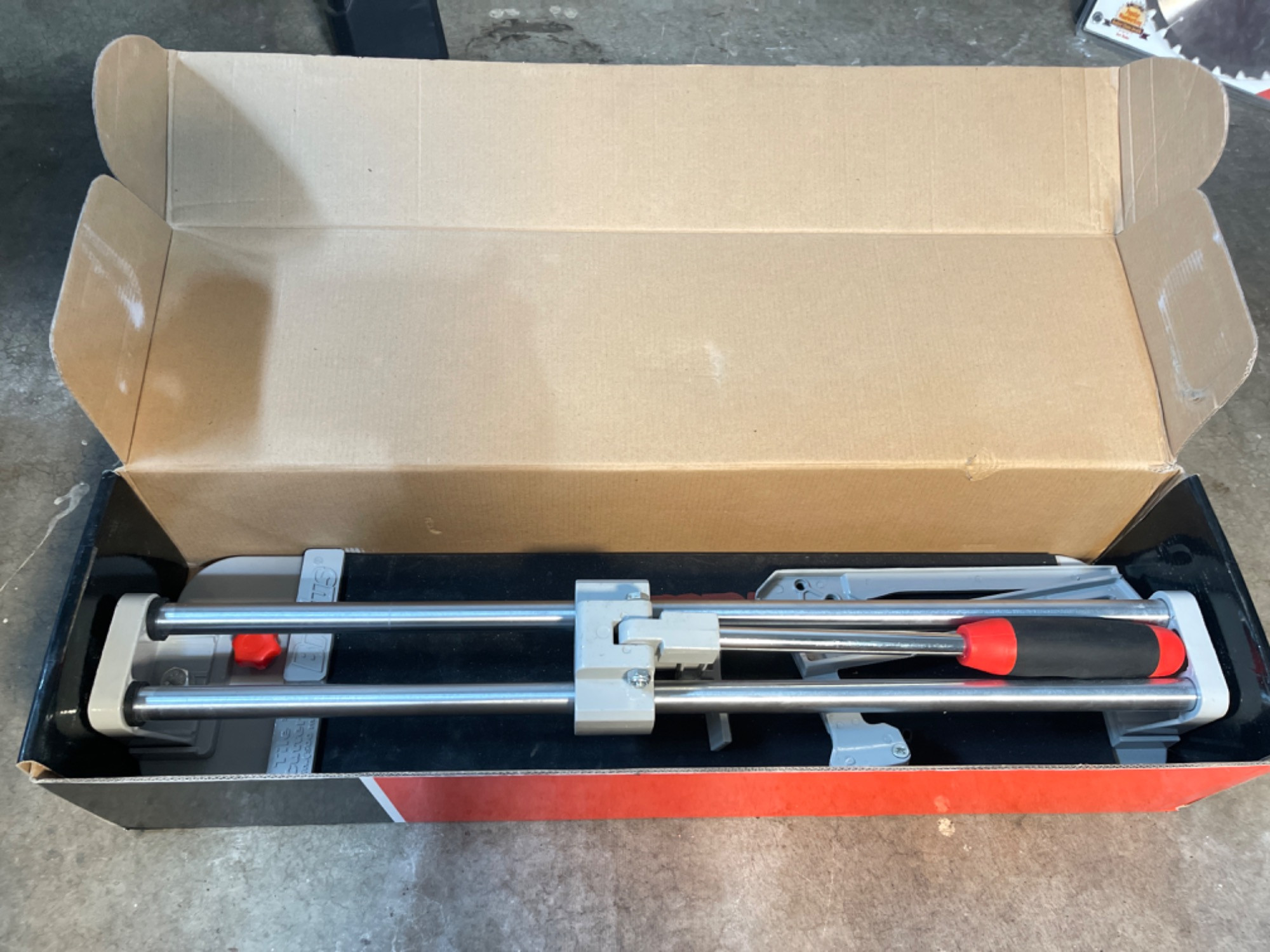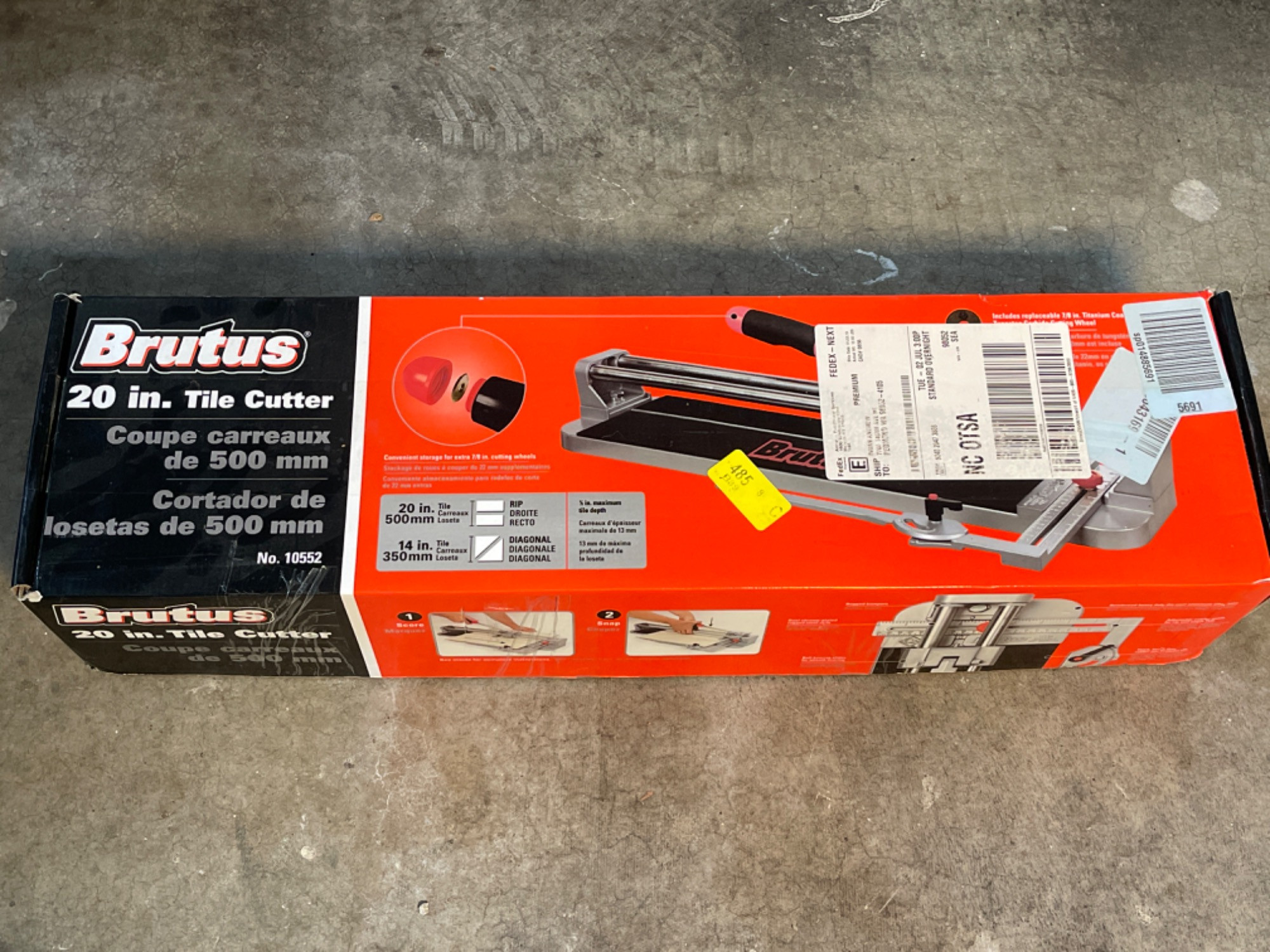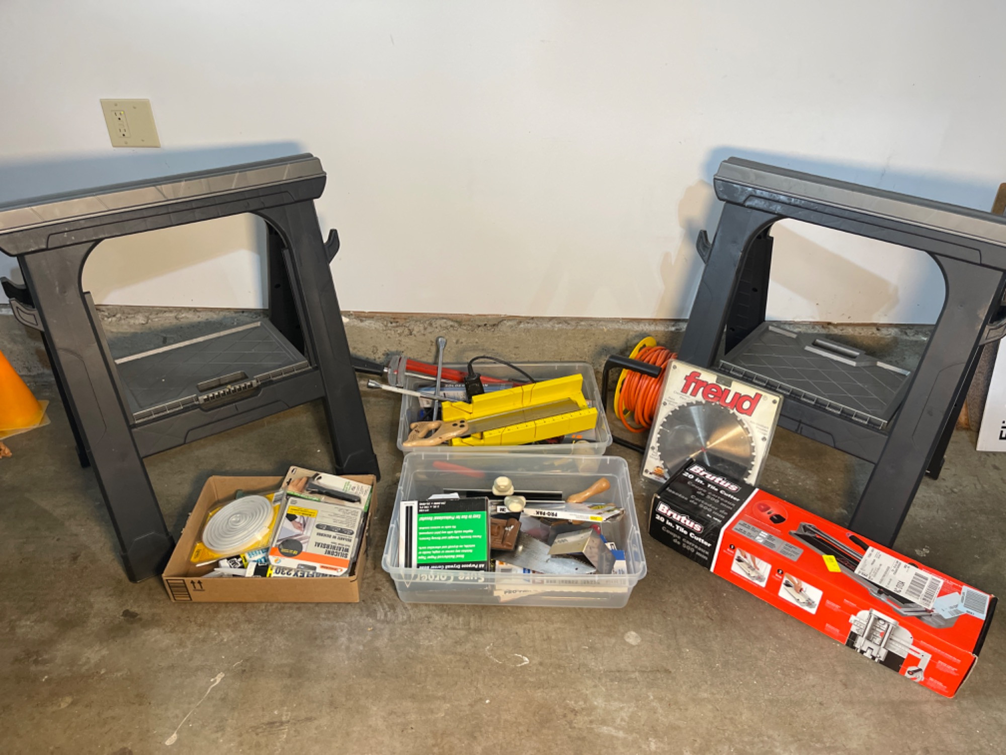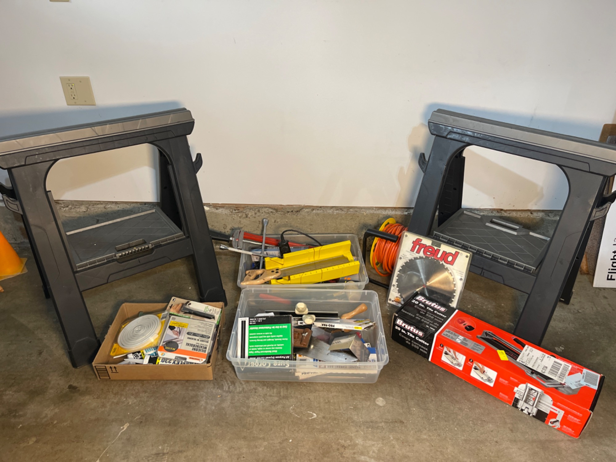 A diverse collection of hand tools, power tool accessories, and construction essentials, including various saws, blades, measuring tools, and fasteners. Also features a Brutus 20” tile cutter (new in box), a Freud 10” saw blade, and a heavy-duty extension cord reel. Two sturdy plastic sawhorses included, standing at 31.5” H. Not all items have been individually inspected or photographed—refer to images for details.