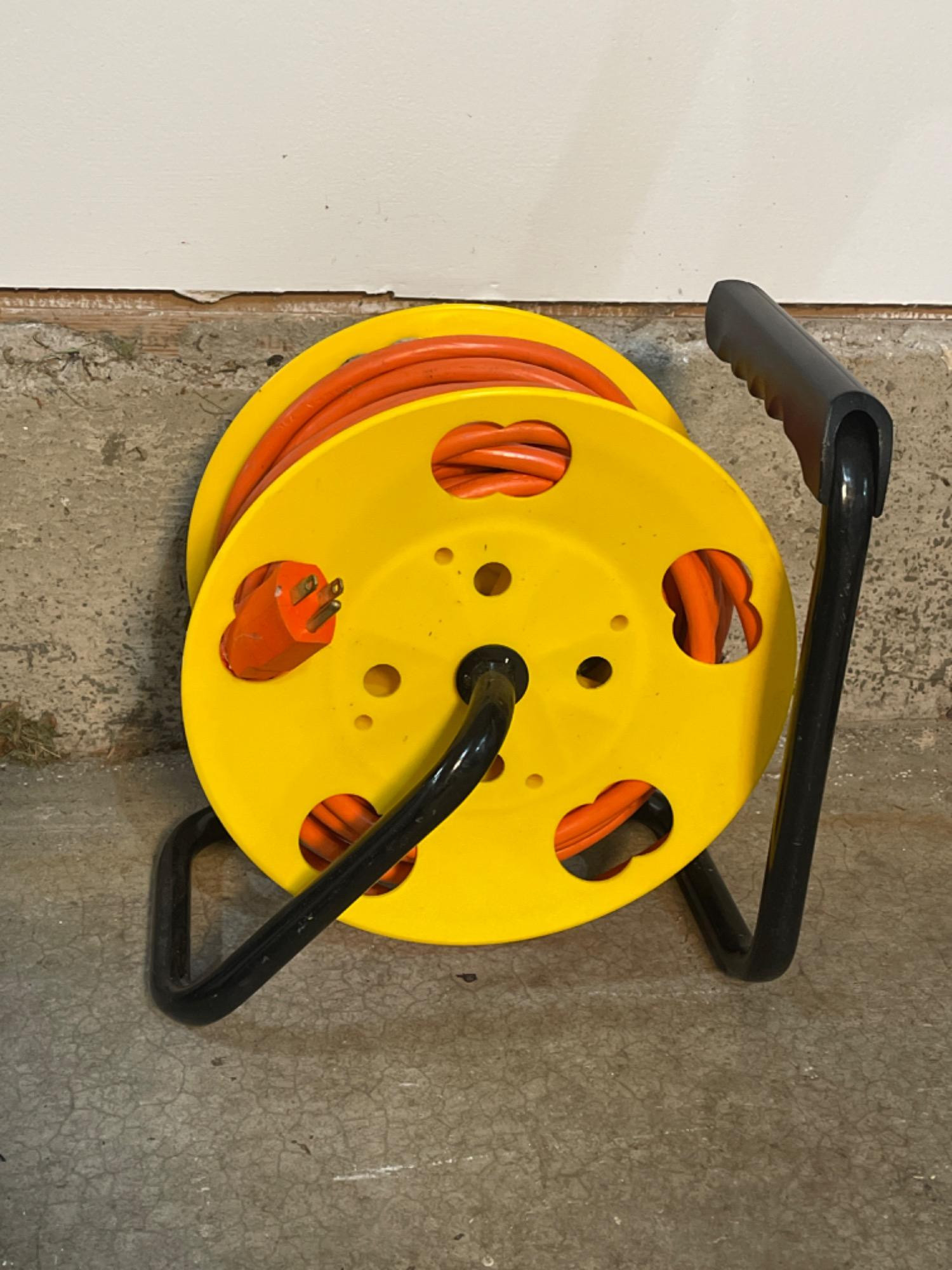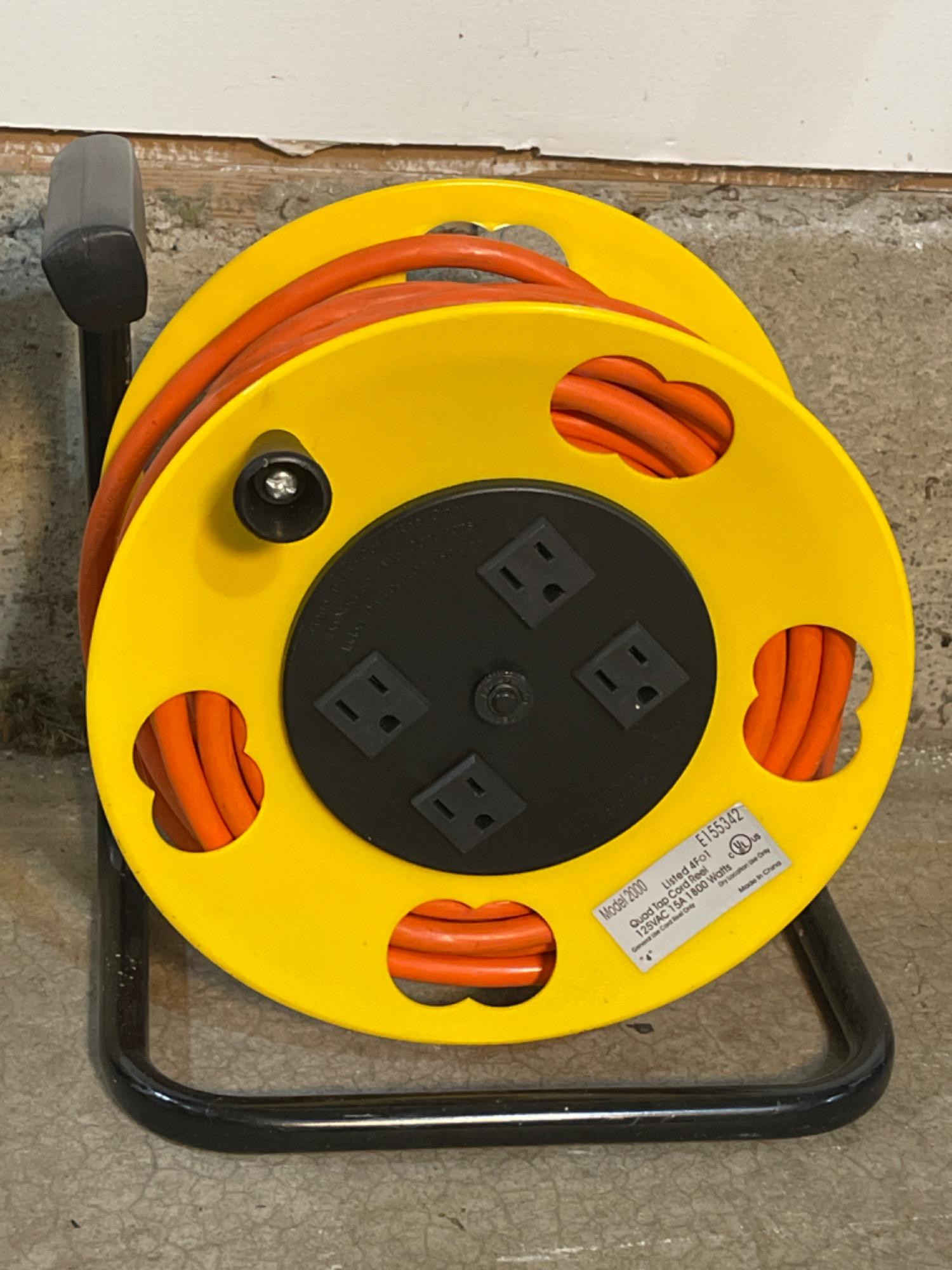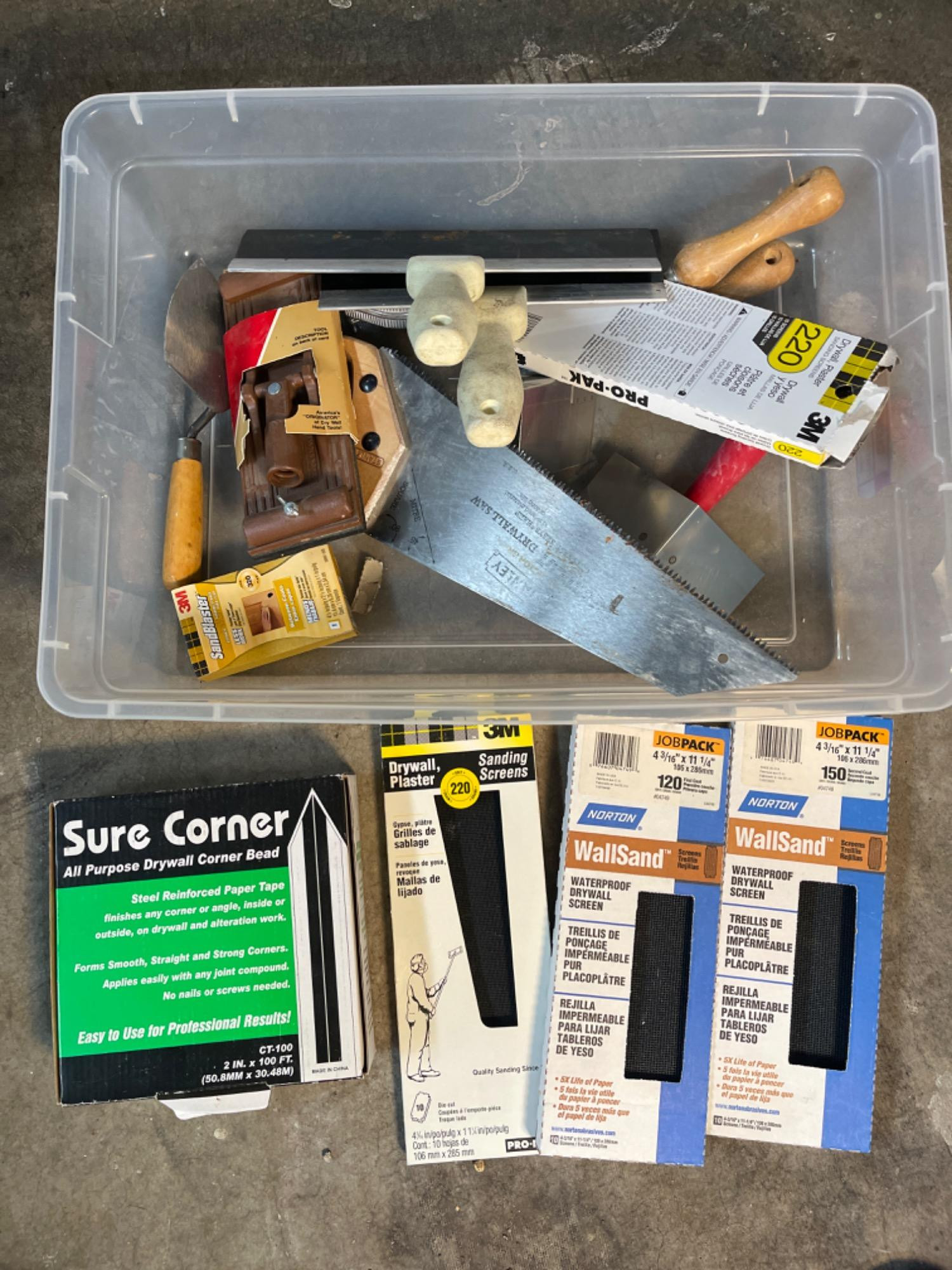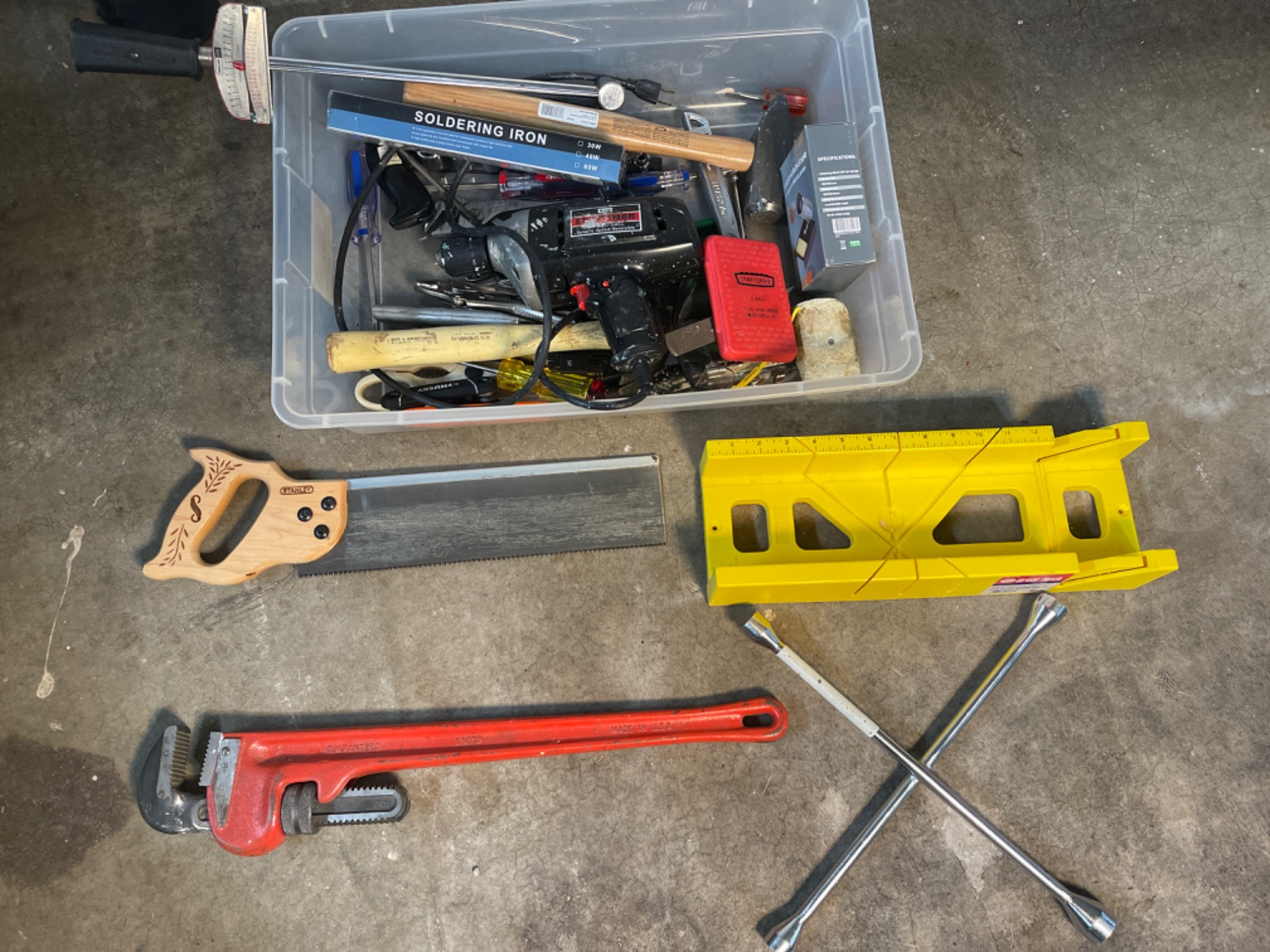 A diverse collection of hand tools, power tool accessories, and construction essentials, including various saws, blades, measuring tools, and fasteners. Also features a Brutus 20” tile cutter (new in box), a Freud 10” saw blade, and a heavy-duty extension cord reel. Two sturdy plastic sawhorses included, standing at 31.5” H. Not all items have been individually inspected or photographed—refer to images for details.