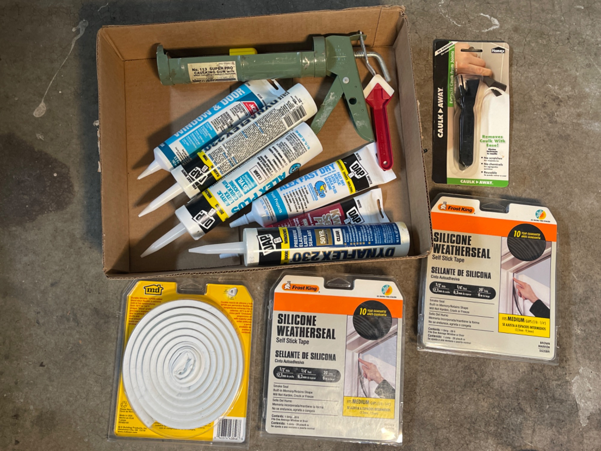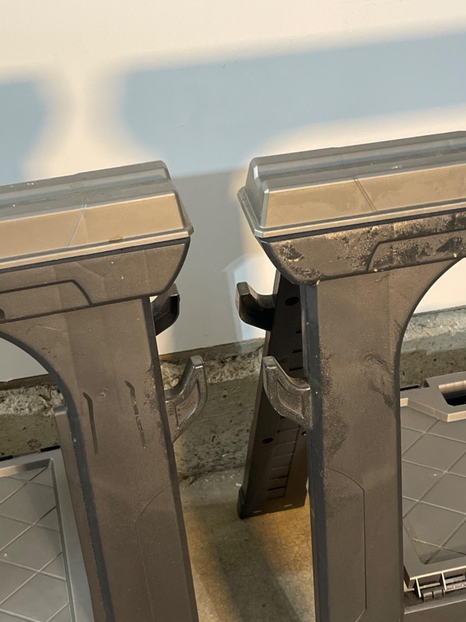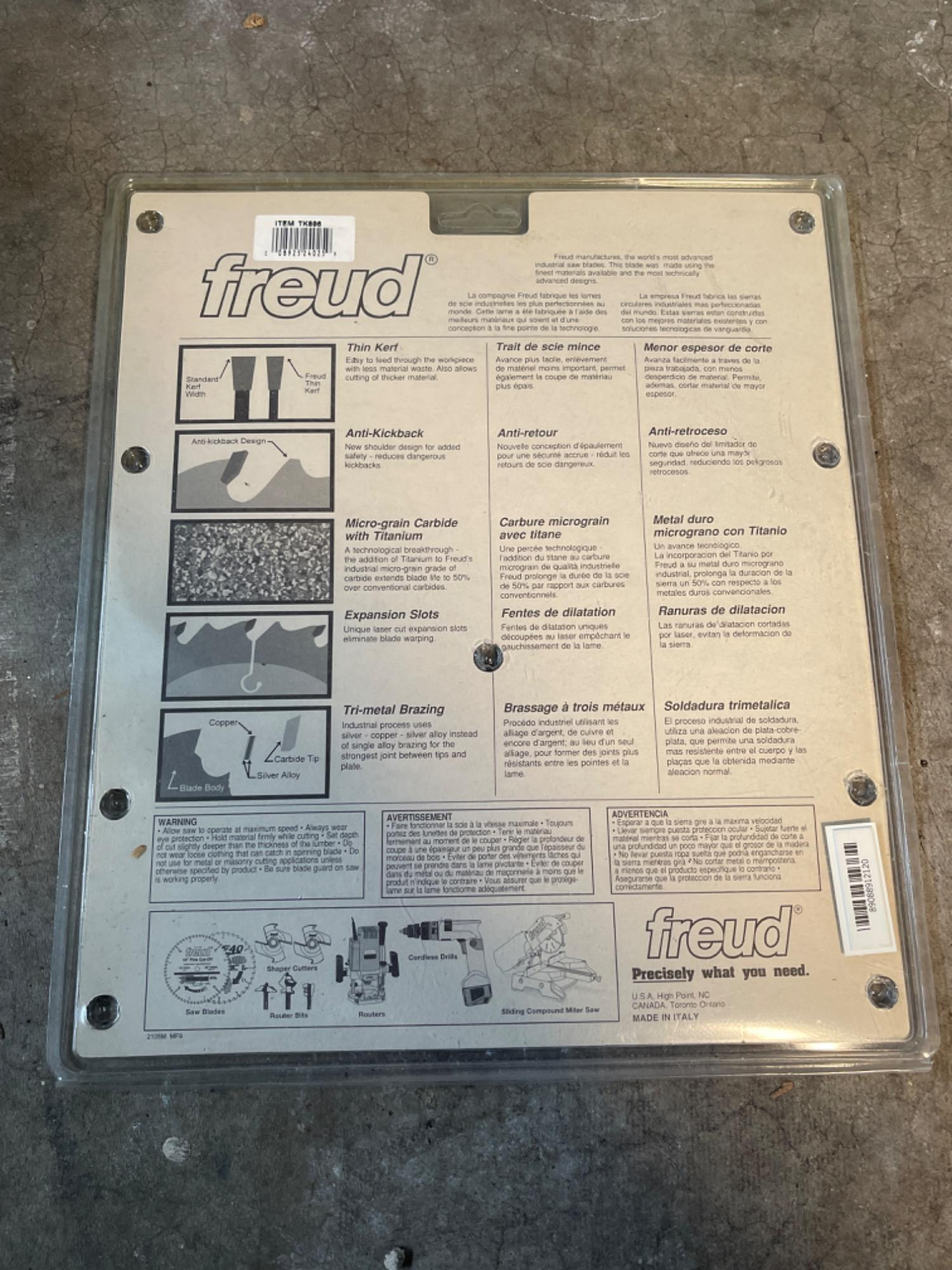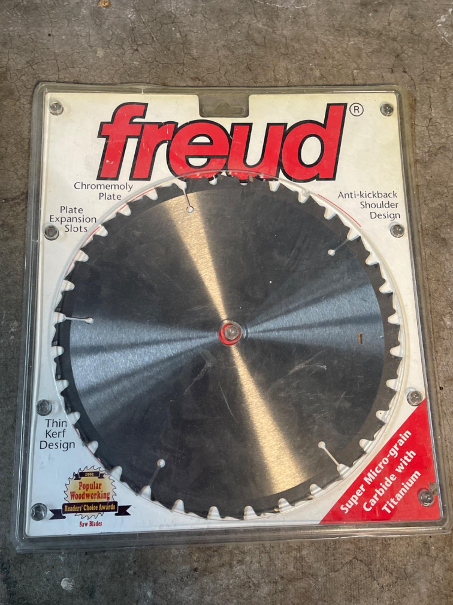 A diverse collection of hand tools, power tool accessories, and construction essentials, including various saws, blades, measuring tools, and fasteners. Also features a Brutus 20” tile cutter (new in box), a Freud 10” saw blade, and a heavy-duty extension cord reel. Two sturdy plastic sawhorses included, standing at 31.5” H. Not all items have been individually inspected or photographed—refer to images for details.