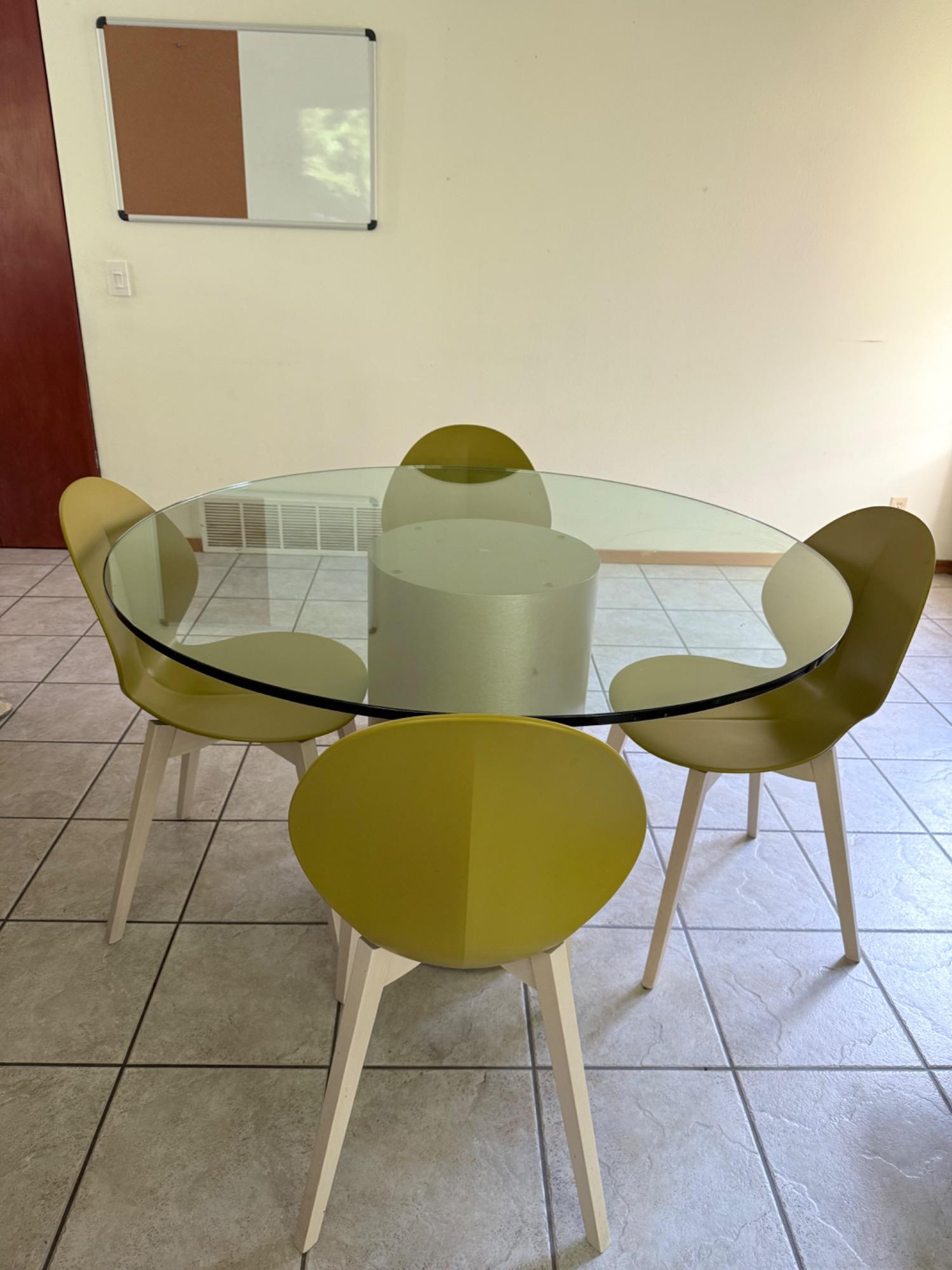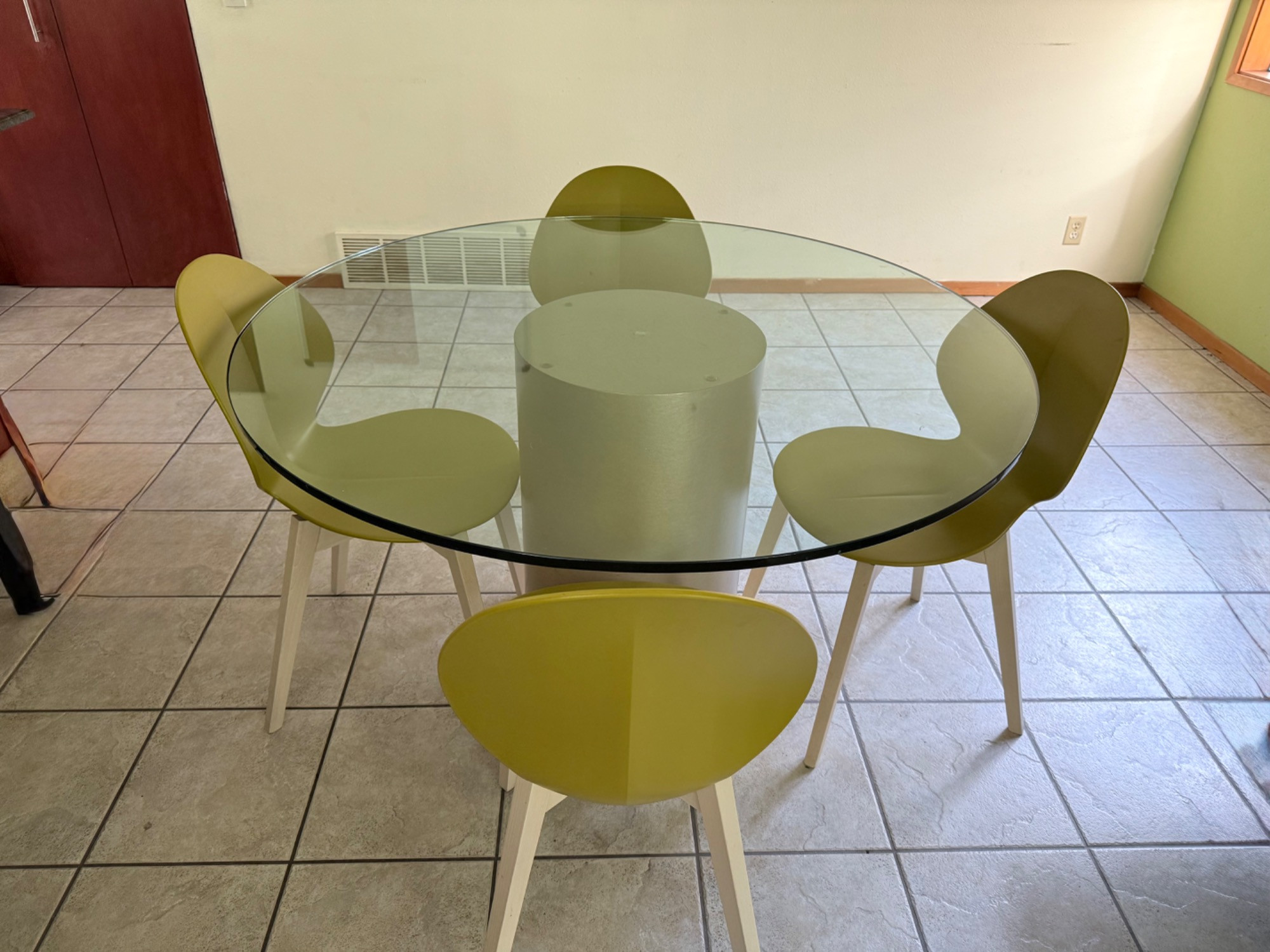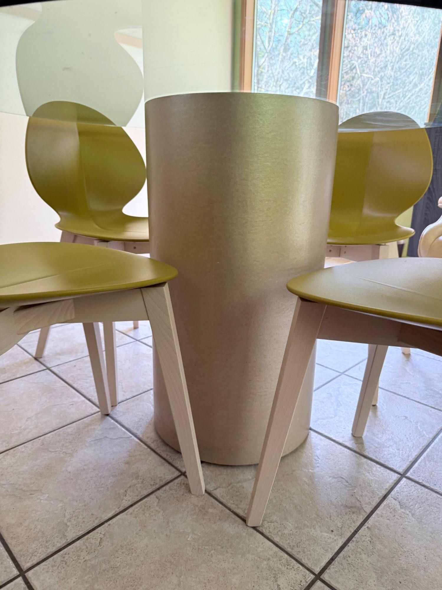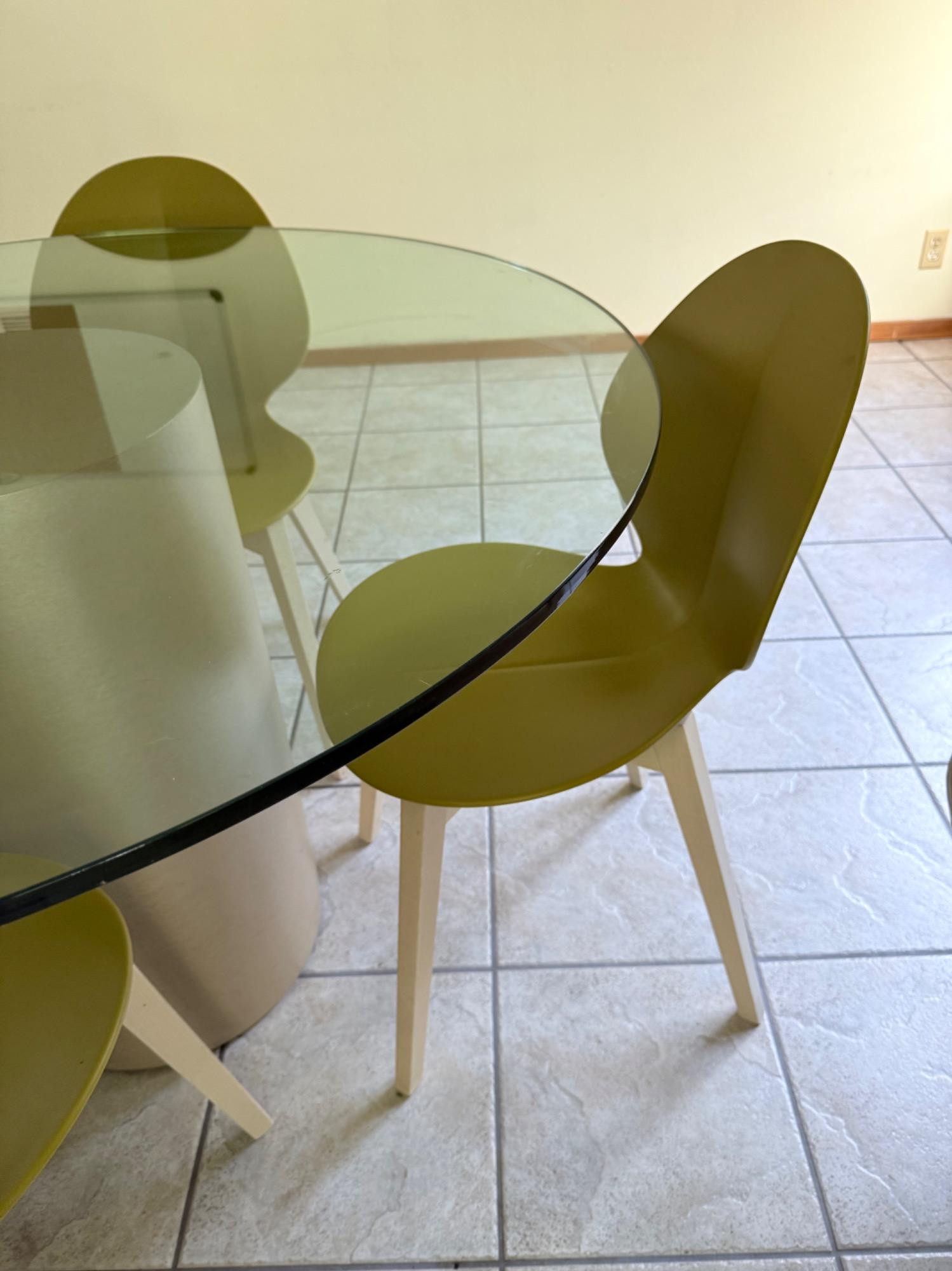 Glass dining table set with four contemporary Calligaris dining chairs made in Italy. The seat and backrest are made of a smooth, curved yellow plastic material, creating an organic and contemporary aesthetic. The chair is supported by four light-colored wooden legs that slightly angle outward, giving it a Scandinavian or mid-century modern feel. Manufacturer: Calligaris Dining table glass is 48 inches in diameter and 30 inches tall. The base material of the dining table is unknown. The seatback is 33" high from the ground, seat height is 18" seat width is 17".
