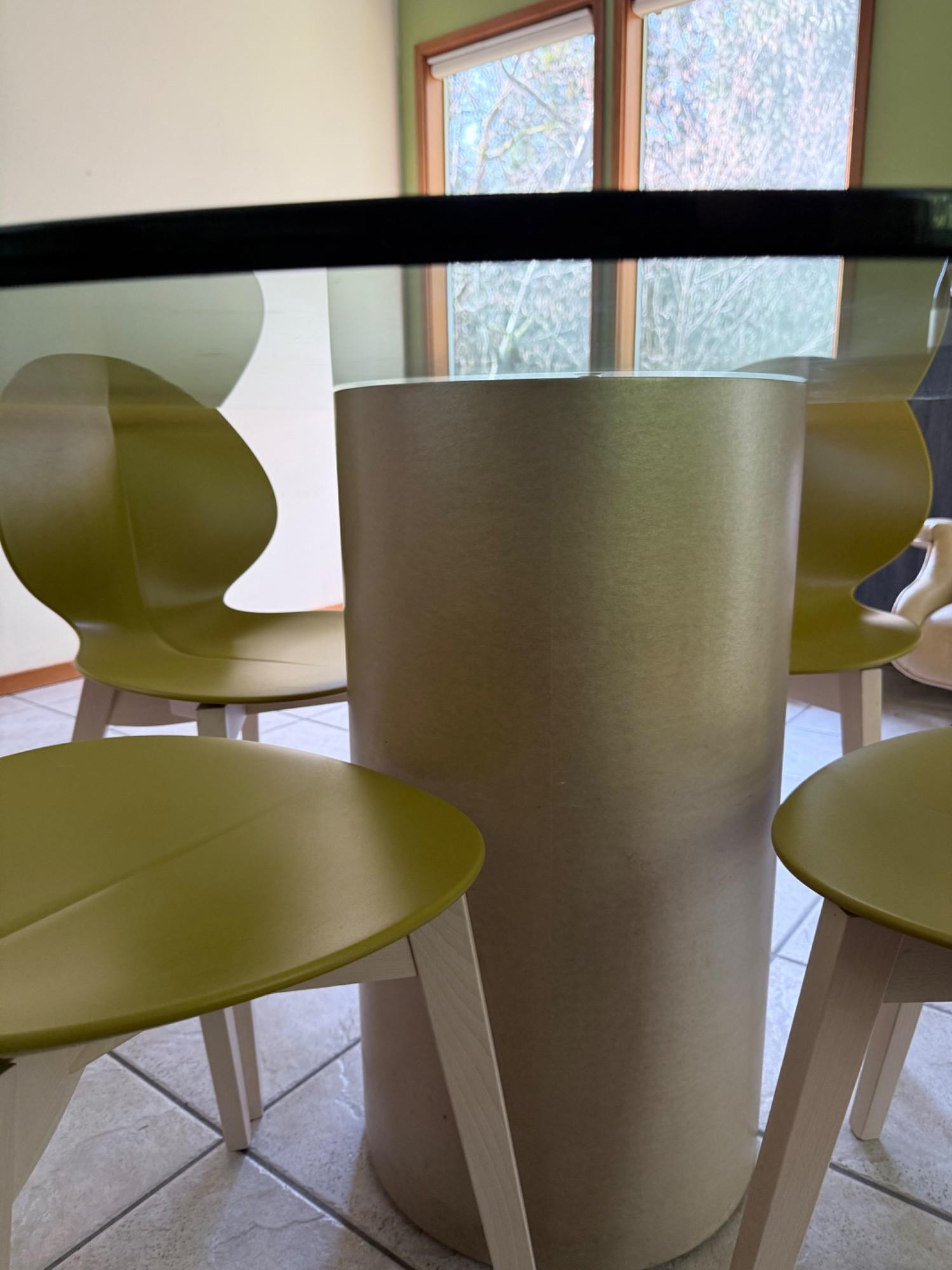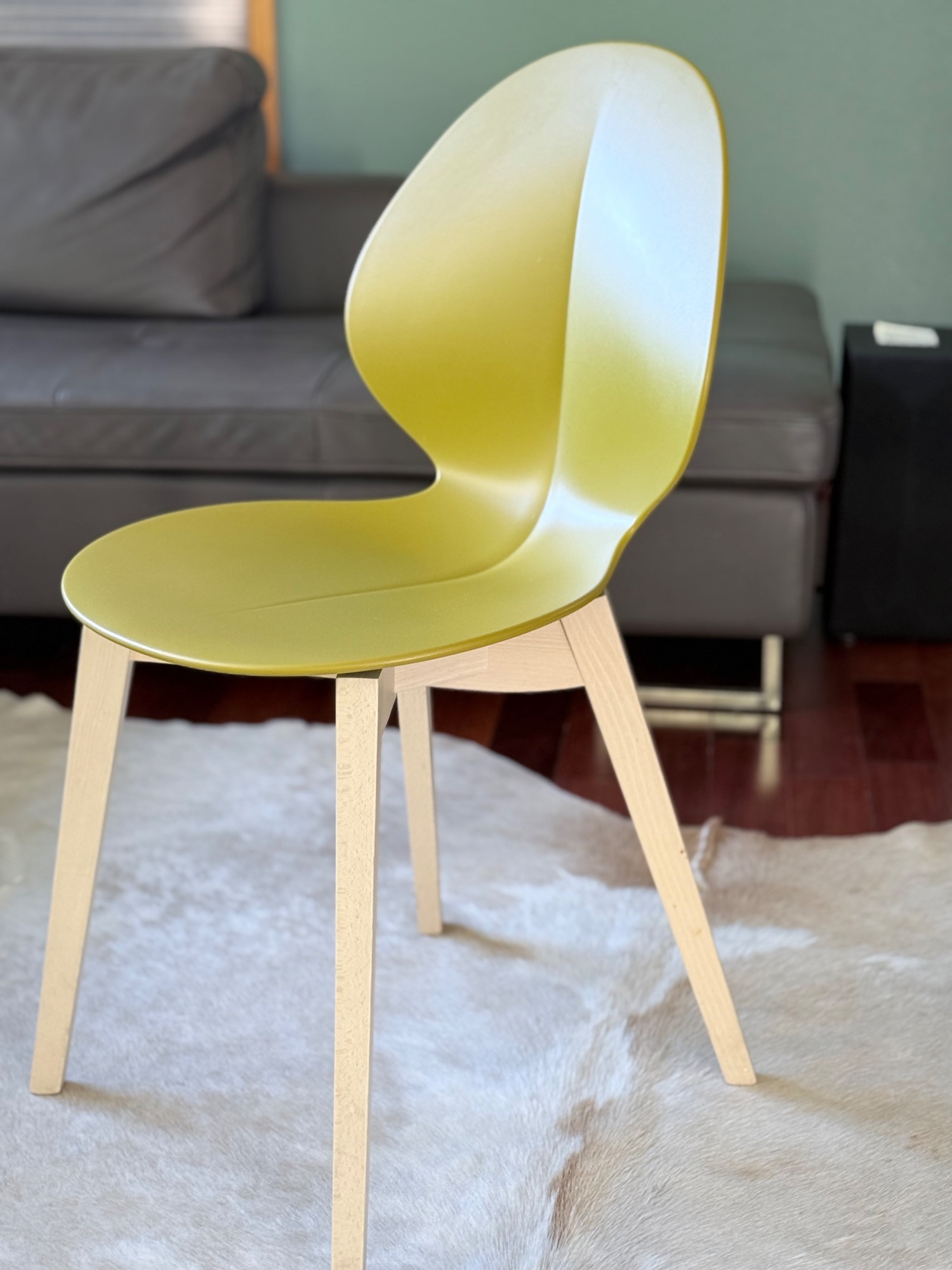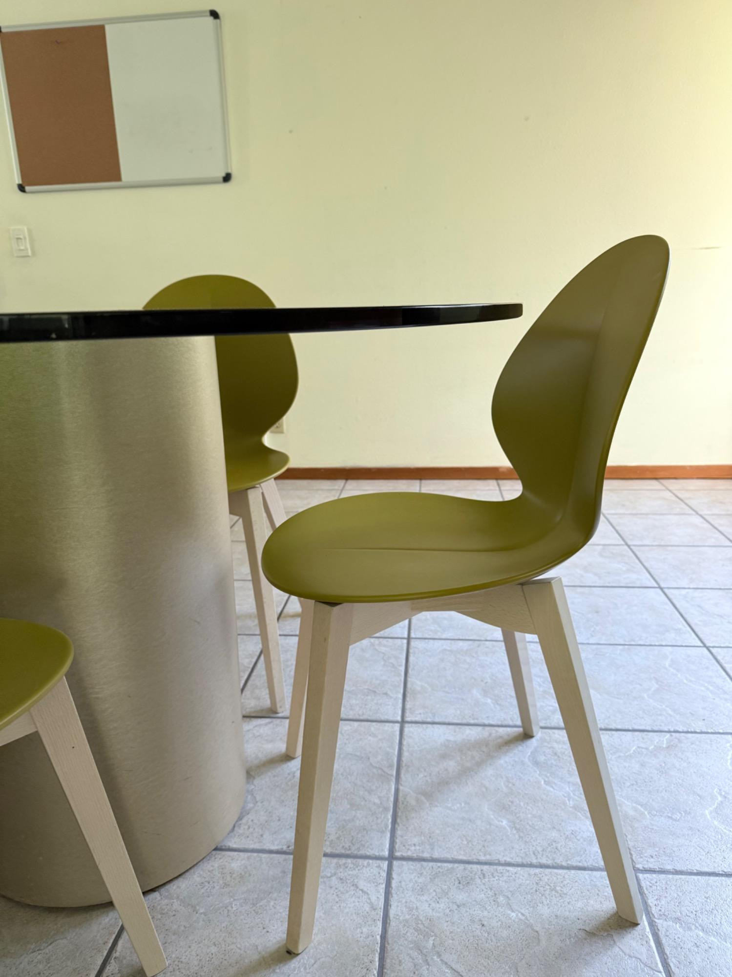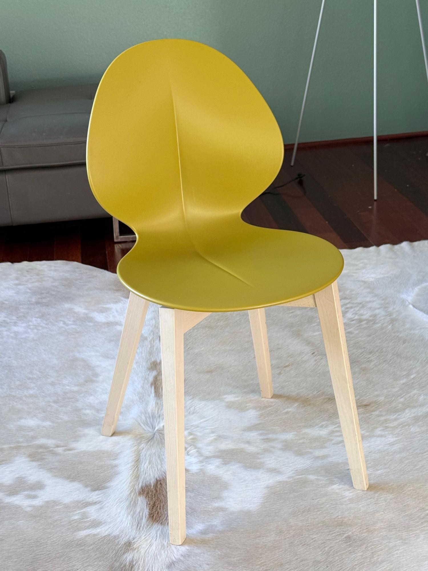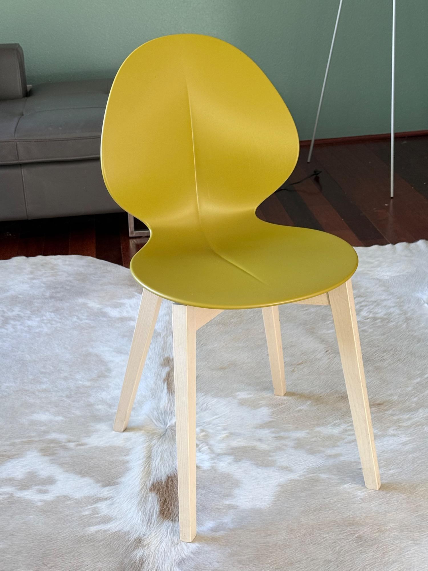 Glass dining table set with four contemporary Calligaris dining chairs made in Italy. The seat and backrest are made of a smooth, curved yellow plastic material, creating an organic and contemporary aesthetic. The chair is supported by four light-colored wooden legs that slightly angle outward, giving it a Scandinavian or mid-century modern feel. Manufacturer: Calligaris Dining table glass is 48 inches in diameter and 30 inches tall. The base material of the dining table is unknown. The seatback is 33" high from the ground, seat height is 18" seat width is 17".