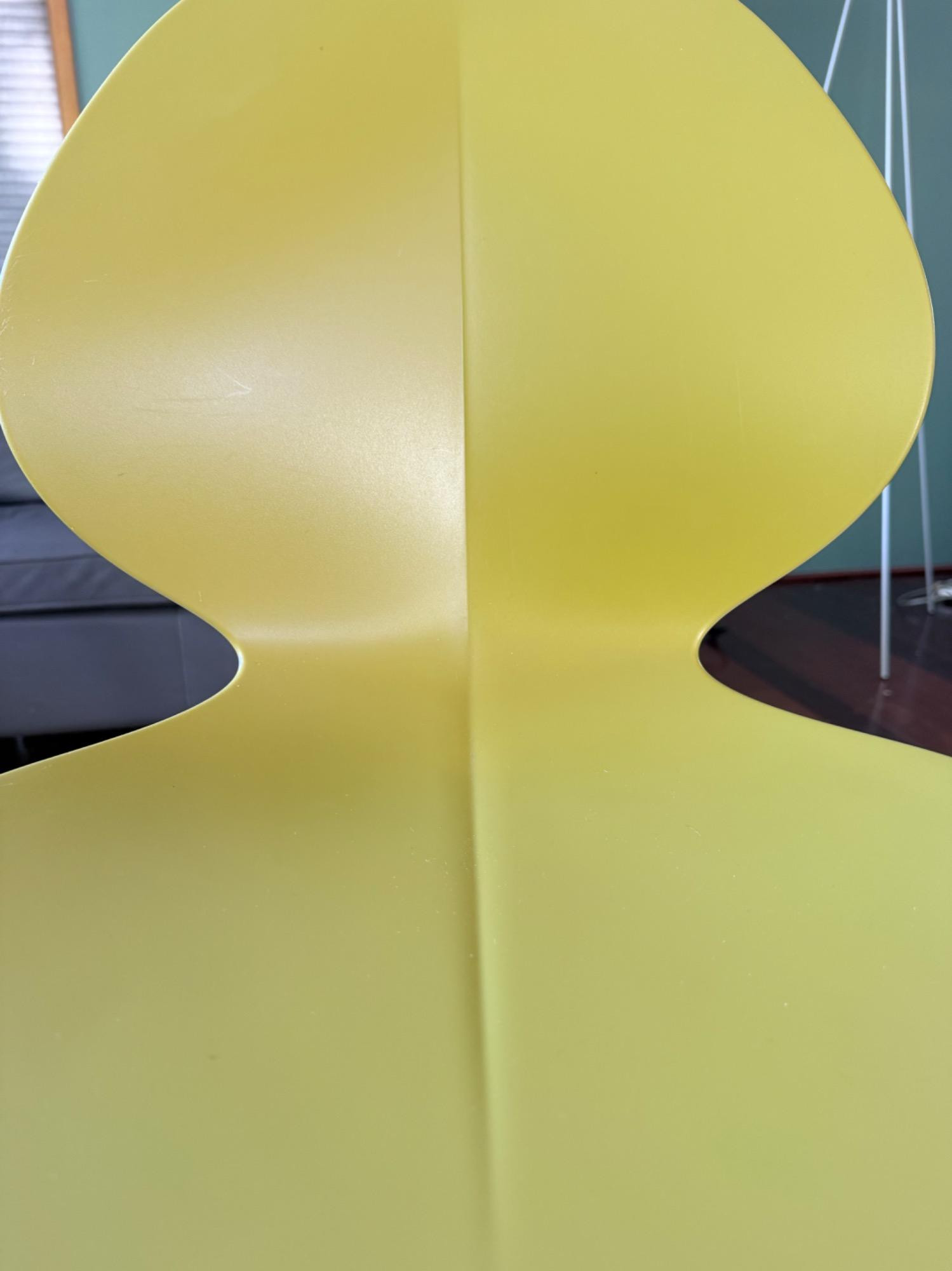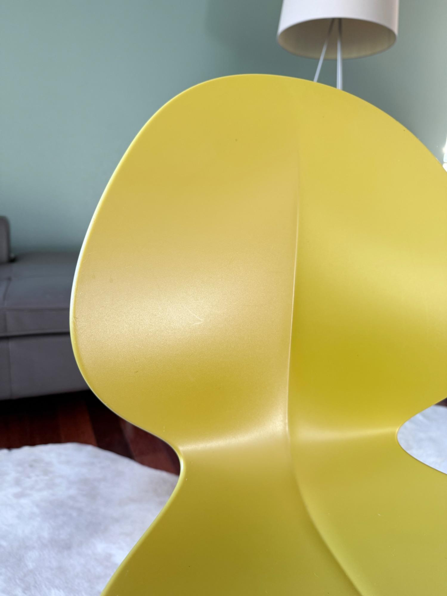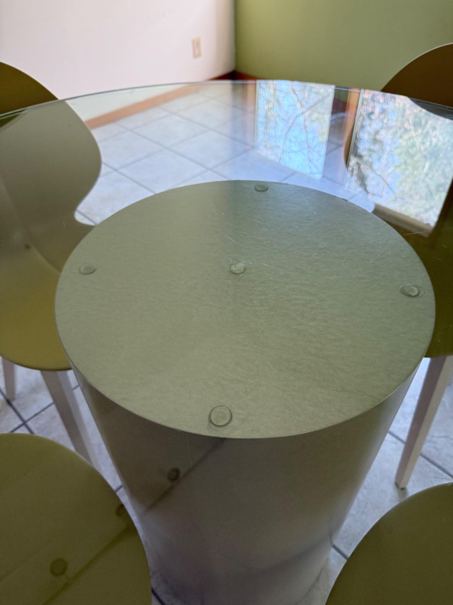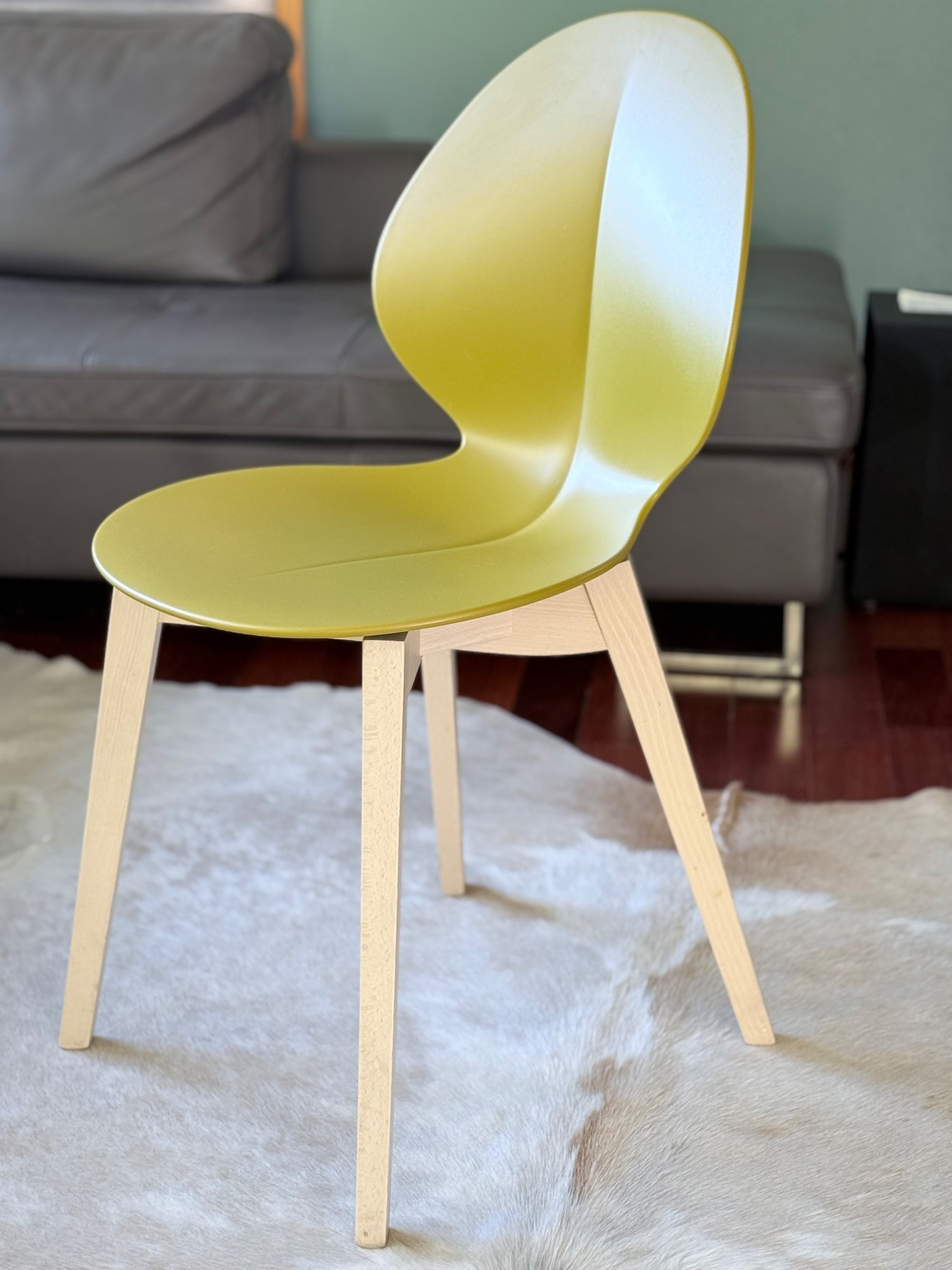 Glass dining table set with four contemporary Calligaris dining chairs made in Italy. The seat and backrest are made of a smooth, curved yellow plastic material, creating an organic and contemporary aesthetic. The chair is supported by four light-colored wooden legs that slightly angle outward, giving it a Scandinavian or mid-century modern feel. Manufacturer: Calligaris Dining table glass is 48 inches in diameter and 30 inches tall. The base material of the dining table is unknown. The seatback is 33" high from the ground, seat height is 18" seat width is 17".