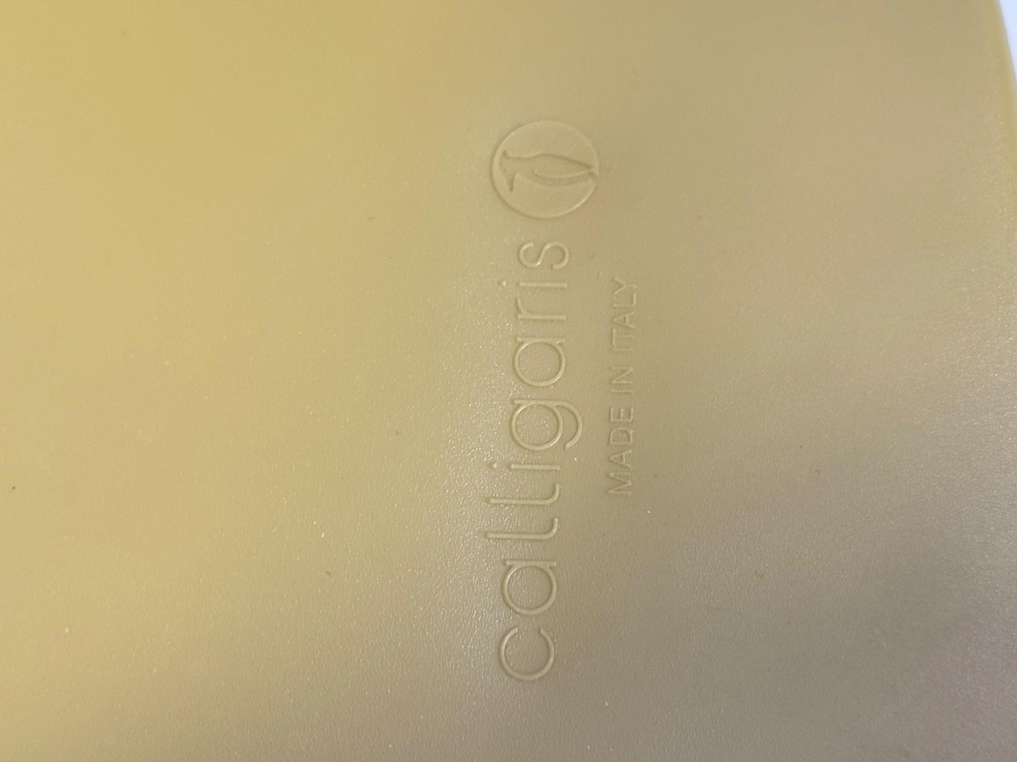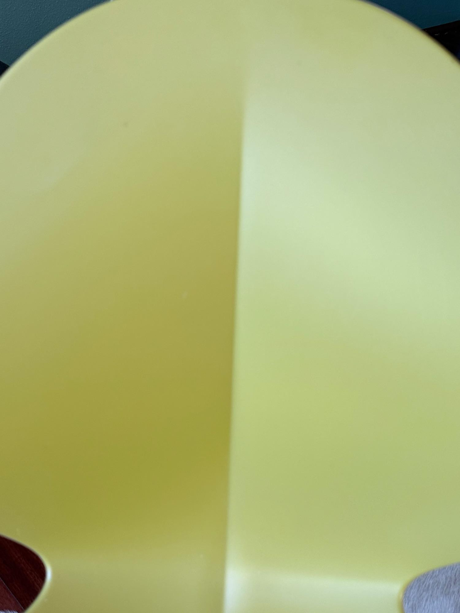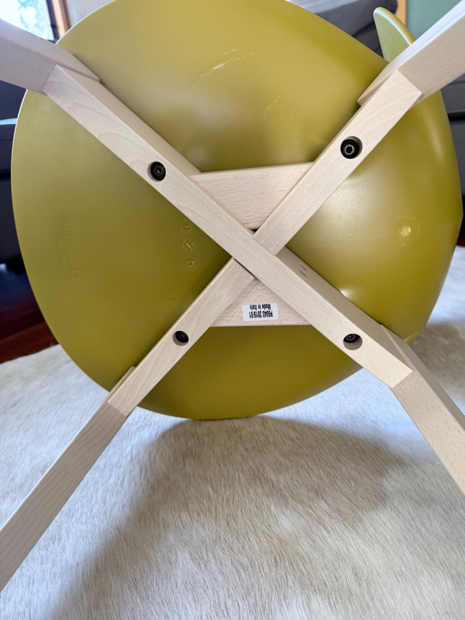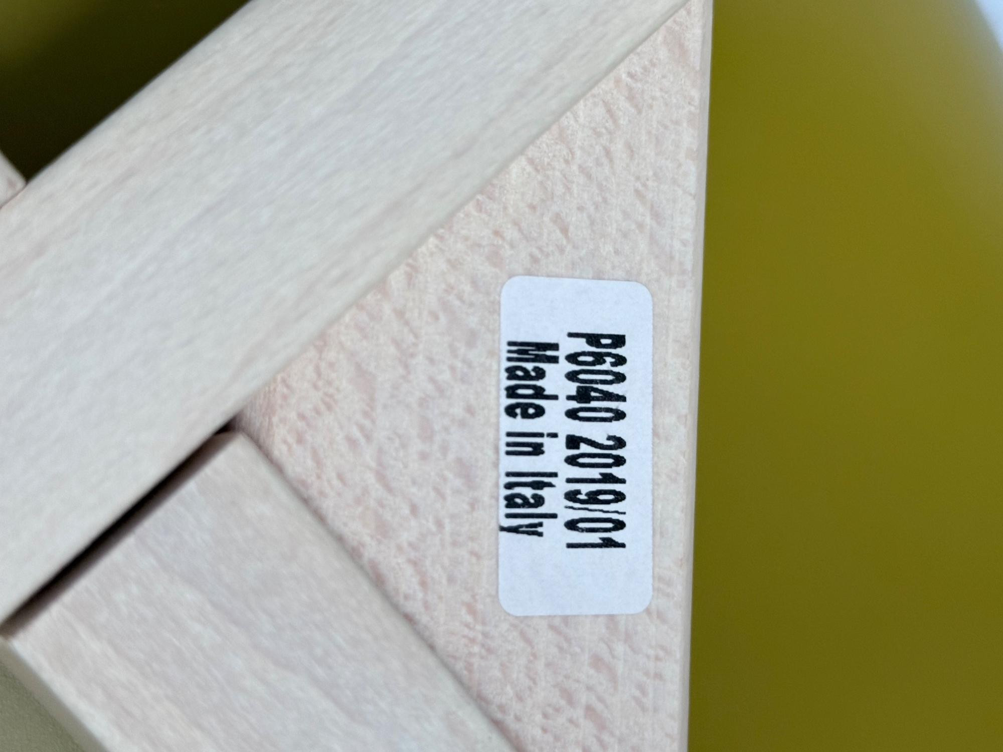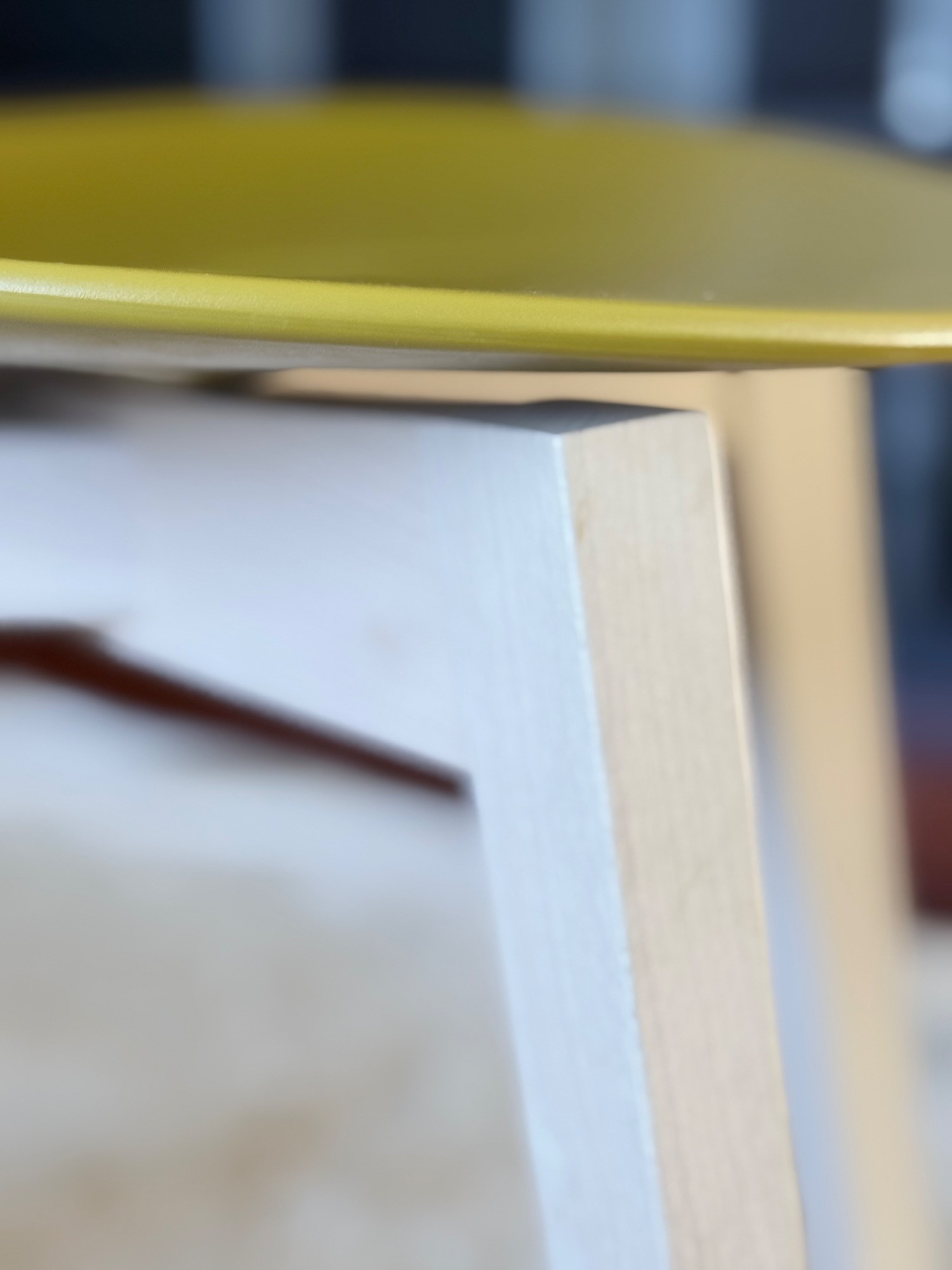 Glass dining table set with four contemporary Calligaris dining chairs made in Italy. The seat and backrest are made of a smooth, curved yellow plastic material, creating an organic and contemporary aesthetic. The chair is supported by four light-colored wooden legs that slightly angle outward, giving it a Scandinavian or mid-century modern feel. Manufacturer: Calligaris Dining table glass is 48 inches in diameter and 30 inches tall. The base material of the dining table is unknown. The seatback is 33" high from the ground, seat height is 18" seat width is 17".