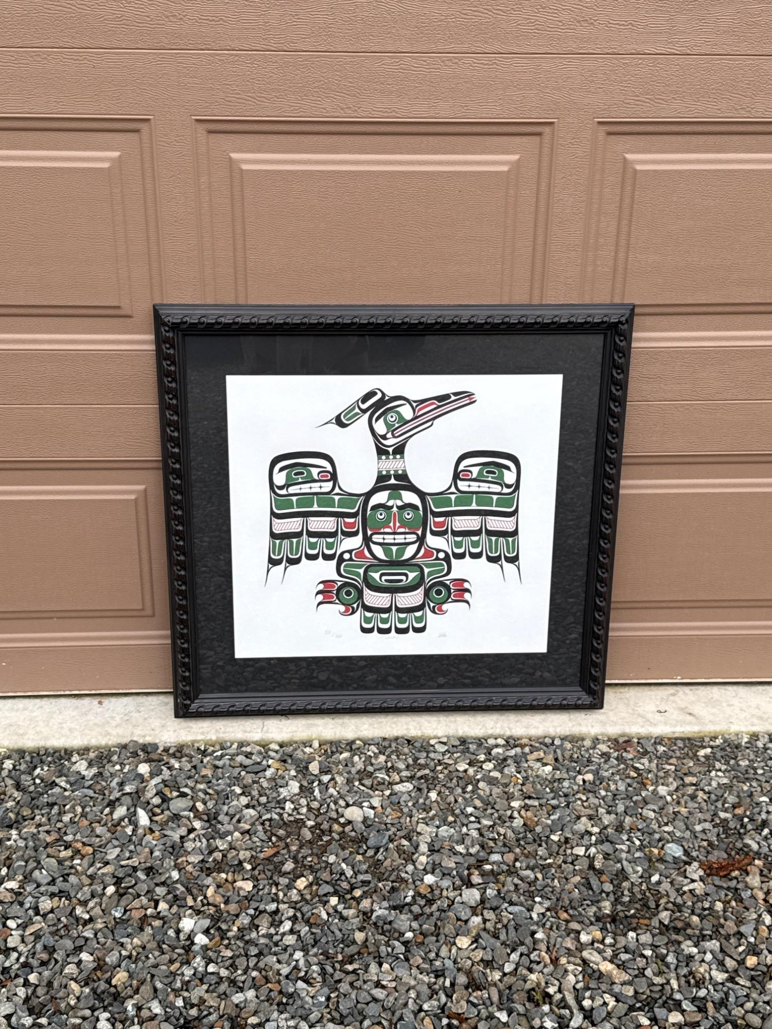 "LOON" by William Wasden Jr (WA). #53/160 Framed Art *Signed The Loon is an ancestor of the Village Island people. An answer names Gi'gagwe transformed from a loon into a man to start up a clan. The people who descended from him had a right to wear the loon as a crest. Many noble family married to receive this prestigious prerogative. William is the keeper of a loon helmet. This dance privilege was passed to his maternal, great-grandfather as a dowry from his maternal, great-grandmother, whose people descend from this story. The loon is a messenger and represents the wealth under the ocean. This print is very strict Kwakwaka'wakw formline.