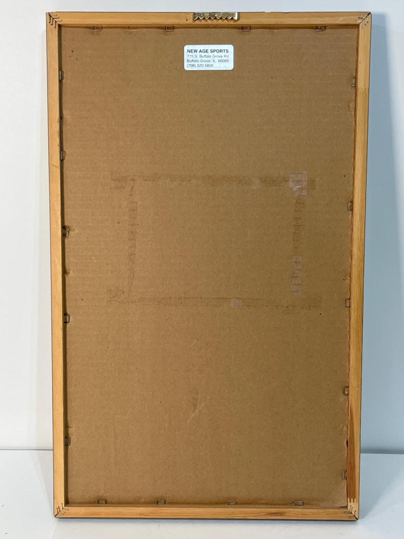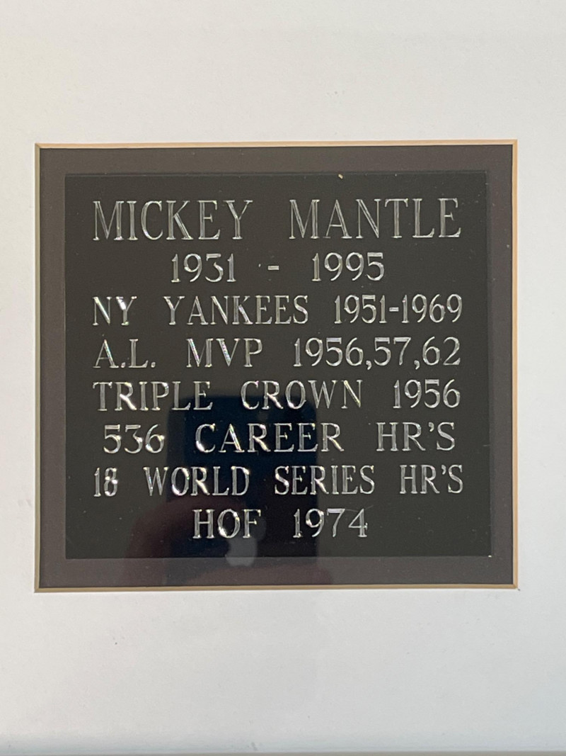 This is a signed photo of the legendary Mickey Mantle with an engraved plaque below, all nicely framed in a wood and glass frame. The photo is an 8”x10” signed in dark blue permanent marker and the entire framed piece is 13”x19”. The framing looks to have been done professionally.