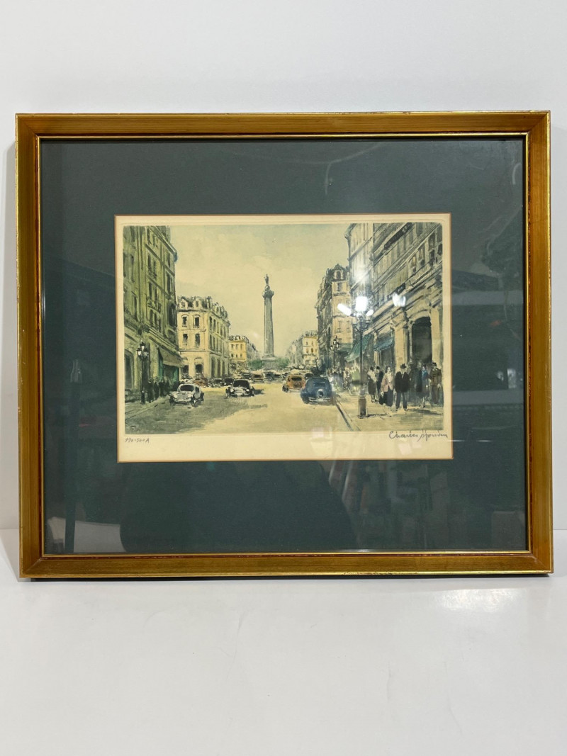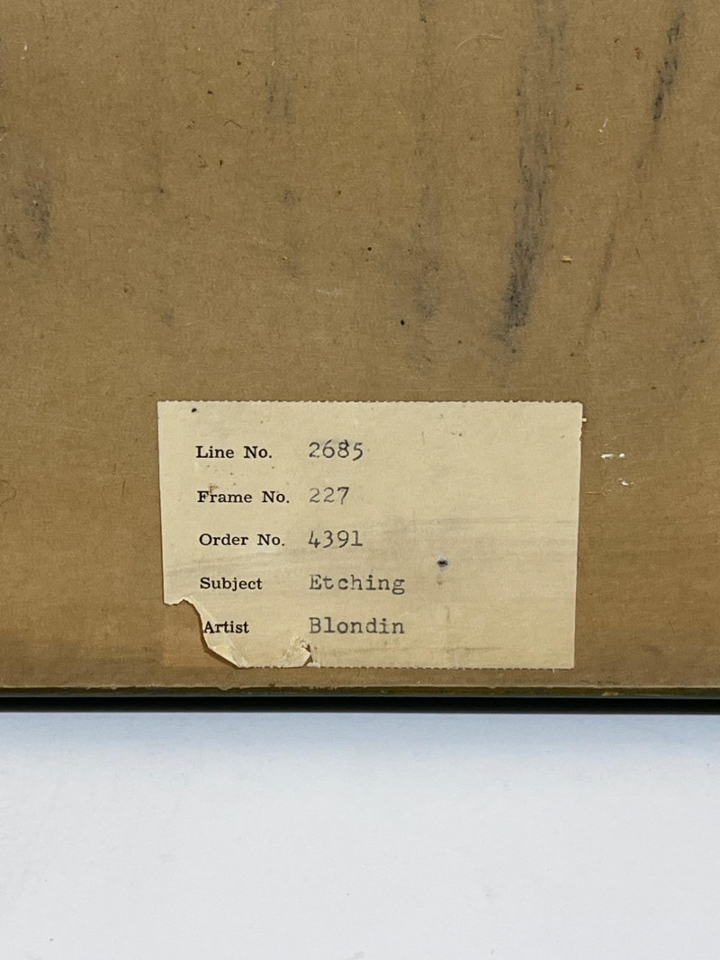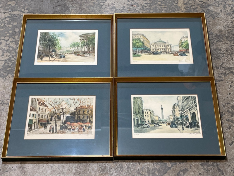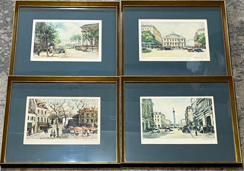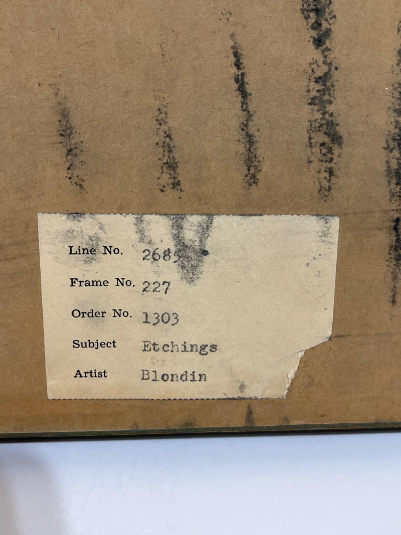 This lot is four etchings of France by the artist Charles Blondin. The paintings are numbered and professionally framed. The frames measure 18 3/4 x 16 and the art measures 12“ x 9“. The art itself is in great condition while the frames show some signs of wear.