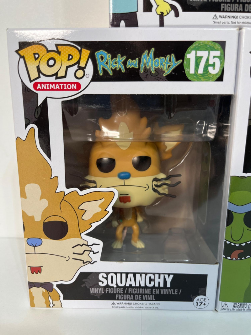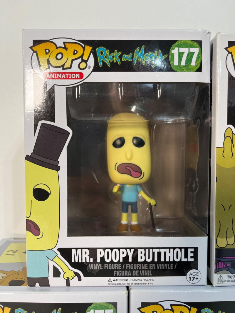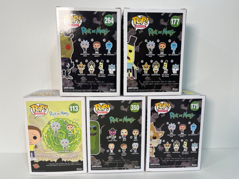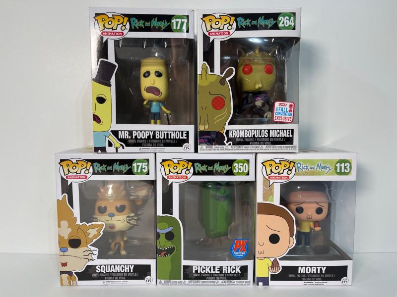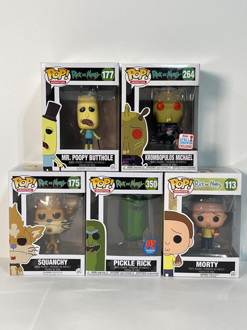 This lot of Funko Pop! are the first of two lots from the popular show, Rick and Morty. There are a total of 5 figures including Mr. Poopy Butthole #177, Krombopulos Michael #264, Squanchy #175, Pickle Rick #350, and Morty #113. The figurines all come in their original packaging that look to have never been opened.