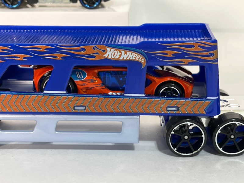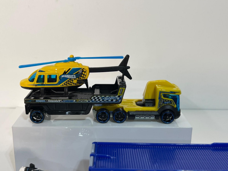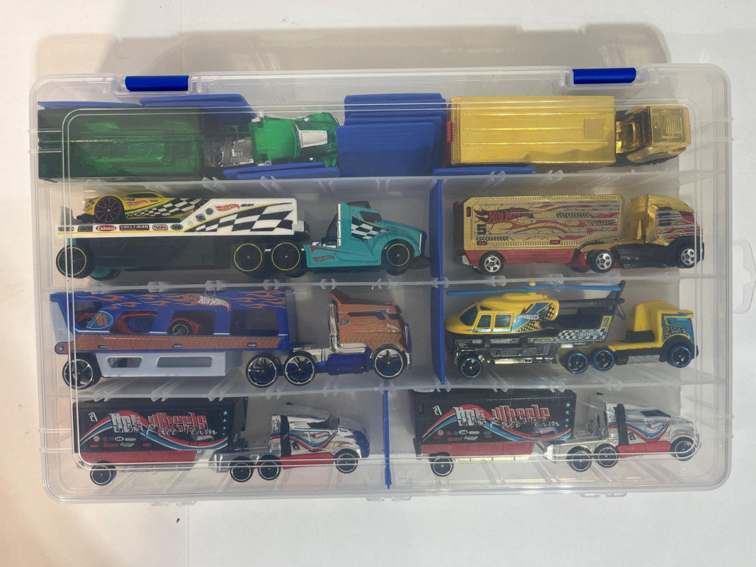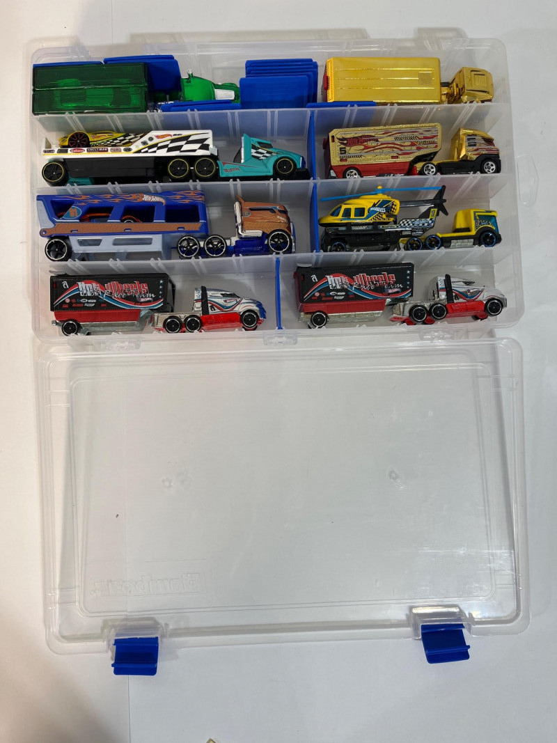 This single sided case is full of big rigs hauling the cargo we dreamt of as kids: race cars and helicopters! The trailers actually attach to the trucks and the race cars fit right inside the trailers. Note that there is a duplicate truck and trailer.