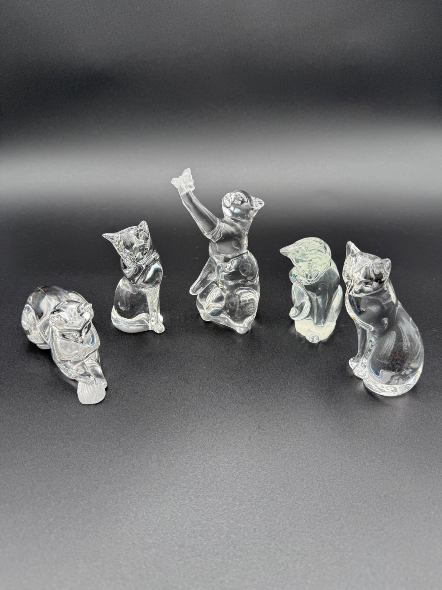 Elegant set of five Lenox fine crystal cat figurines, crafted in Germany. Each piece showcases delicate detailing and a beautifully sculpted form, capturing the playful and graceful nature of cats. The collection includes various poses, such as a reclining cat, a sitting cat, and a cat reaching for a butterfly. Brand: Lenox Material: Fine crystal Year: 1993 (etched marking) Origin: Made in Germany Features: Intricate sculpting, clear glass craftsmanship, collectible set Condition: Excellent with original labels