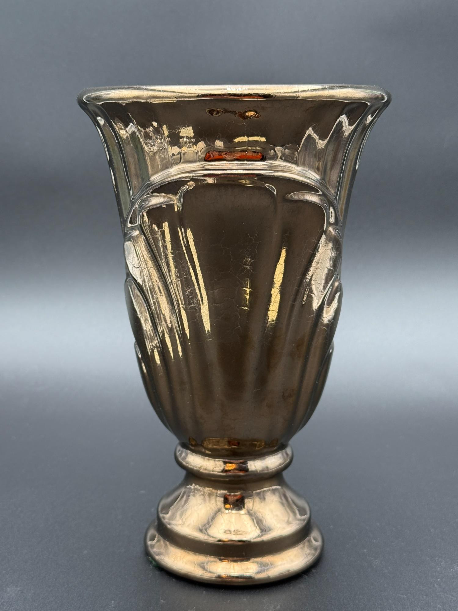 This vintage Haeger vase showcases a striking metallic bronze glaze with an elegant Art Deco-inspired design. The flared silhouette is adorned with raised leaf-like motifs, adding depth and sophistication. Features: Brand: Haeger Material: Glazed ceramic Color: Metallic bronze Design: Flared rim with raised leaf motifs Finish: Reflective crackled glaze Base: Pedestal with original felt pads for stability Dimensions: 9.75” H x 6” W Condition: Slight blemishing consistent with age.