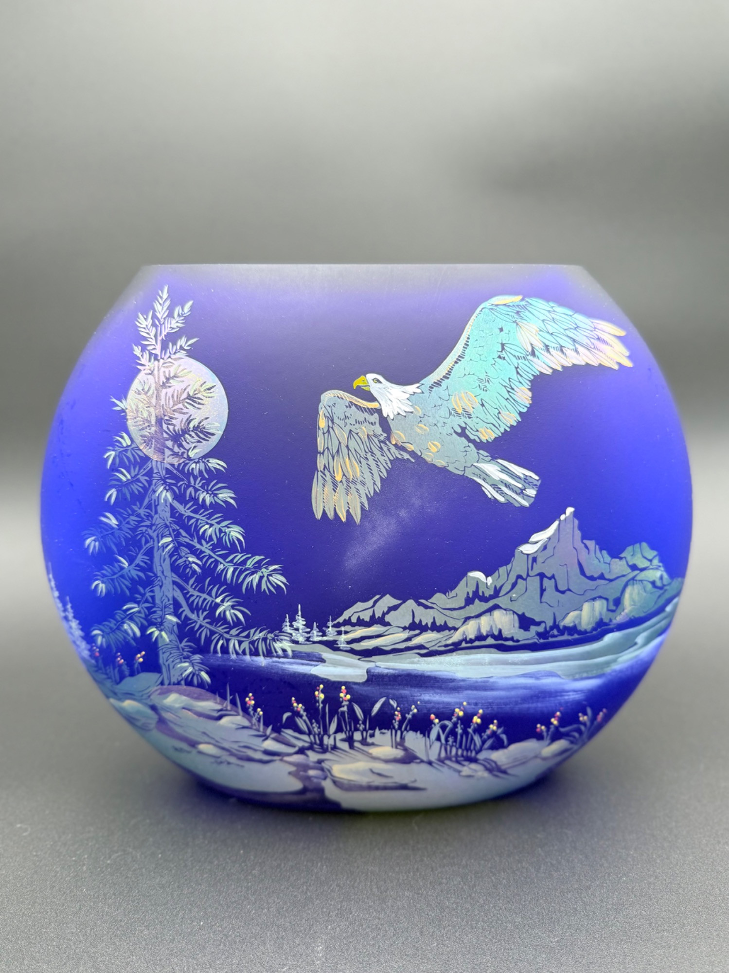 Own a rare and breathtaking piece of Fenton artistry! This “Freedom Soars” oval vase from the 2006 Connoisseur Collection showcases a stunning hand-painted design by Robin Spindler. Crafted in Favrene glass, its deep cobalt blue color is enhanced with pure silver. Creating an iridescent shimmer that highlights the majestic eagle soaring over a peaceful mountain landscape. Key Features: Limited Edition – Only 950 pieces produced Handcrafted in the USA by Fenton Art Glass Elegant cobalt blue color with silver-infused highlights Artist-signed & numbered (#316/950) Dimensions: 11.5” W x 9.5” T x 3” D Original retail price: $595 Includes original box & authentication. Condition: Excellent condition, no chips or cracks. Please review all photos for details.