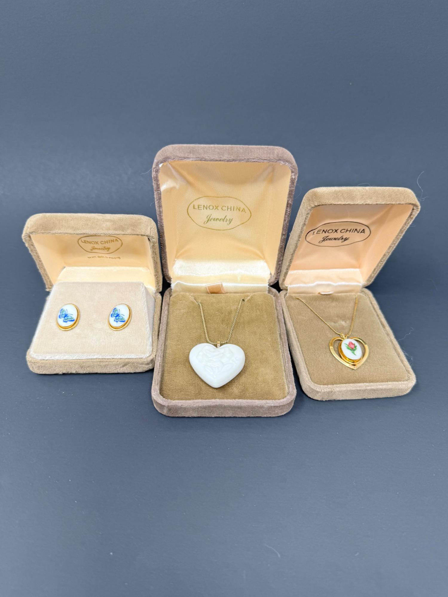 A beautifully crafted Lenox China jewelry set featuring elegant porcelain designs with intricate hand-painted details, framed in gold-tone settings. This vintage collection showcases the fine craftsmanship of Lenox, known for its high-quality porcelain jewelry. 14K Gold Butterfly Earrings: Oval porcelain cabochons with hand-painted blue and green butterflies, set in gold-tone frames with 14K gold posts. Approx. ¾" tall x ½" wide. Marked "Lenox China Jewelry". Rosebud Petite Pendant Necklace: Gold-tone heart-shaped pendant with a hand-painted pink rosebud on porcelain. Stamped "Lenox", paired with an 18" gold-tone chain. Approx. 1" tall x ¾" wide. White Heart Pendant Necklace: Smooth white porcelain heart pendant with an 18" silver-tone chain. Approx. 1" tall x ¾" wide. Condition (Overall): Excellent pre-owned condition with minimal signs of wear. Original Lenox jewelry boxes are included, showing slight wear from storage.