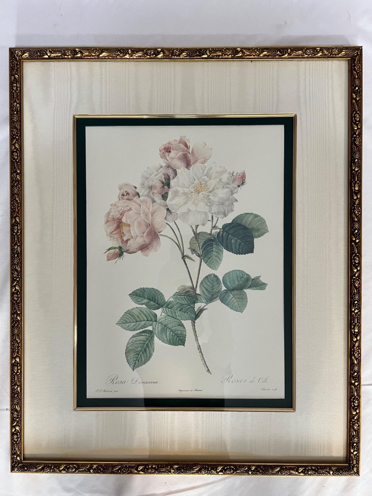 This framed artwork is a reproduction of a botanical illustration by Pierre-Joseph Redouté (1759-1840), titled Rosa Damascena or Rosa Gallica Flore Giganteo. The print is part of Les Roses, a collection of Redouté’s rose illustrations originally published in 1835 by Dufart in Paris. Description: Artist: Pierre-Joseph Redouté (1759-1840) Title: Rosa Damascena / Rosa Gallica Flore Giganteo Publisher: Originally published in Les Roses (1835) Reproduction: This is a high-quality reproduction by The Bombay Company, known for decorative home furnishings. Frame: Ornate gold-tone frame with a double-matted design featuring an inner dark green border. Dimensions: 23.5” W x 28.5” H
