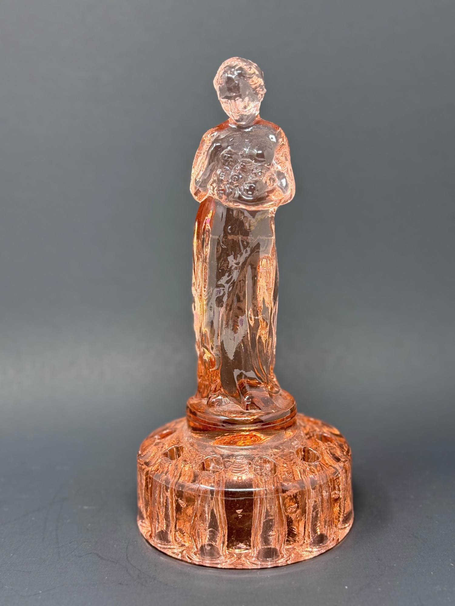 This is a vintage pink depression glass flower frog, commonly referred to as the "Rose Lady" design. The piece features a sculpted female figure standing gracefully atop a round perforated base designed to hold flower stems in place for floral arrangements. Patent number at the bottom of the glass. Key Features: Material: Pink depression glass Design: A standing lady holding a bouquet, likely inspired by early 20th-century decorative glass figurines. Dimensions: 8 inches tall, 4 inches wide Function: The perforated base allows for arranging flowers, making it both a functional and decorative piece. Era: Likely produced during the early-to-mid 20th century, when decorative glass flower frogs were popular.