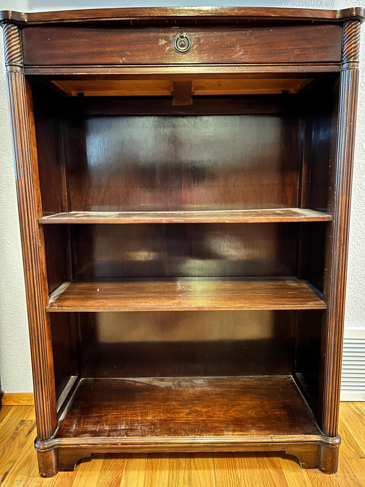 This vintage wooden bookshelf is a classic and functional storage piece with timeless design details. It is crafted from solid wood and finished in a rich dark brown stain, showcasing a warm patina that highlights its age and character. Features: Structure: Three open shelves providing ample storage space. Material: Solid wood with a dark brown finish. Design Details: A single drawer at the top with a round pull. Fluted columns on the sides for an elegant touch. Slightly curved feet for a sturdy base. Dimensions: 30" W x 12" D x 42" H Condition: Shows signs of age and use, with some surface wear on the shelves and bottom.