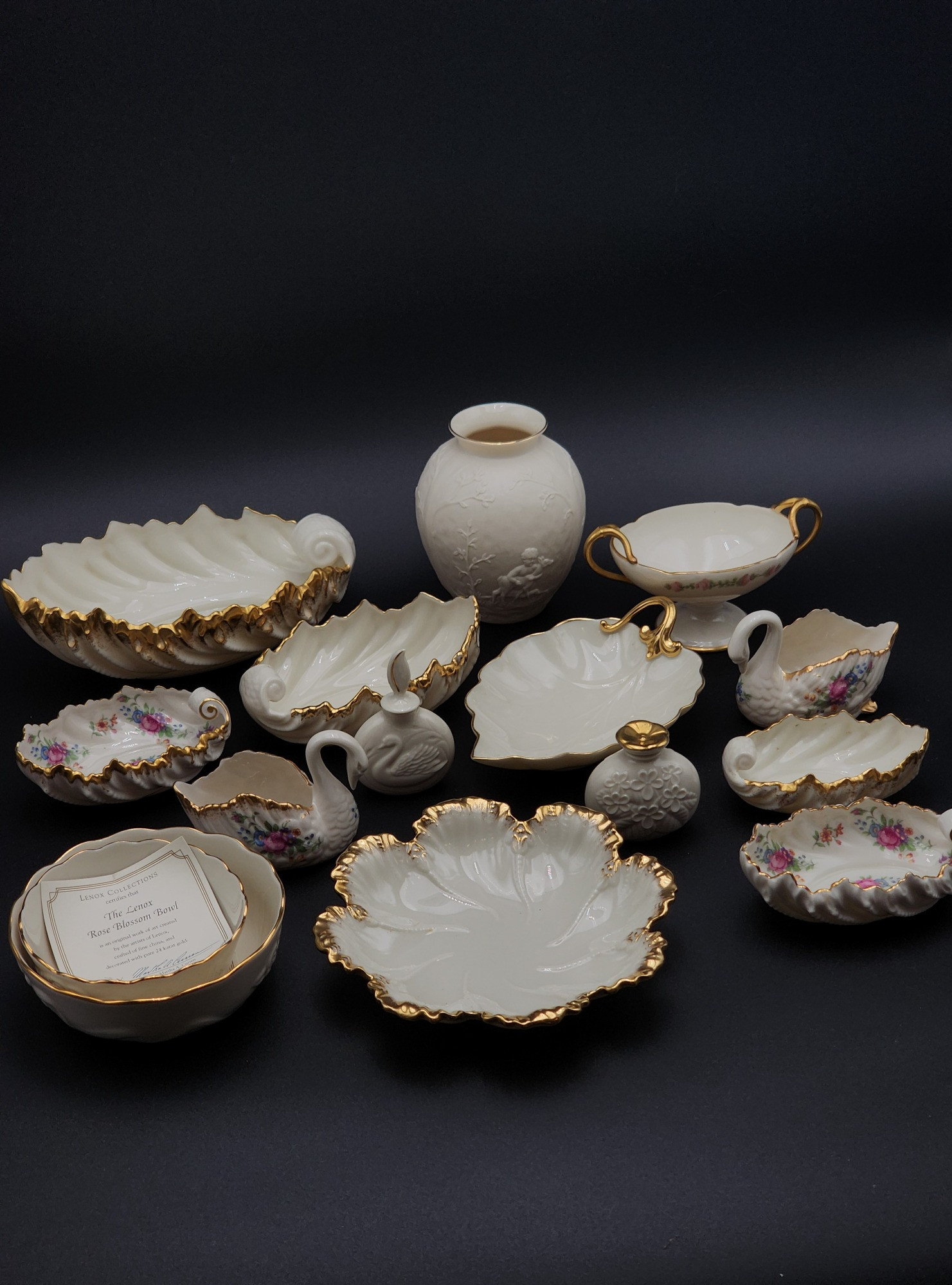 This Lenox 24K Gold Trim Leaf Plates & Small Dishes are a set of 15 beautifully design and crafted pieces of ceramic. Perfect for your tea party or any floral event you have planned. Some are from the Lenox Rose Blossom collection. No cracks or chips were found on the pieces Dimensions: Pieces varying heights from 2" in Tall and from 7" in long.