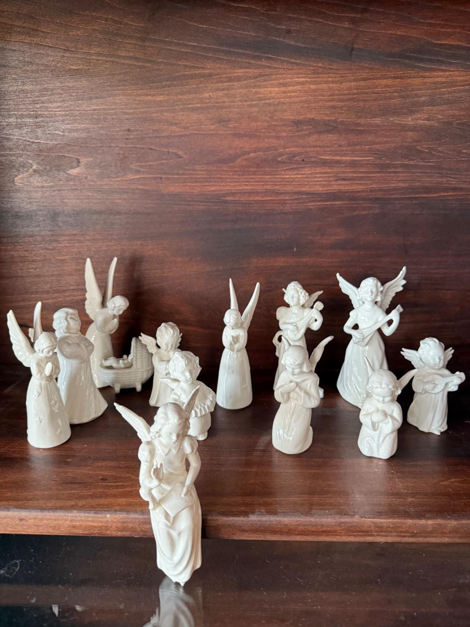 This collection features a beautifully arranged assortment of 11 porcelain Goebel angel figurines. The set includes various angelic figures in different poses, each with unique details such as musical instruments, praying hands, and flowing robes. Angels range in size from 2.5" -5" Height Features: Material: Glazed porcelain with a smooth, glossy finish Designs: Angels in various poses—praying, playing musical instruments, and holding symbolic objects Details: Intricately sculpted wings, flowing robes, and serene facial expressions Color: White ceramic, all in good condition, no chips.