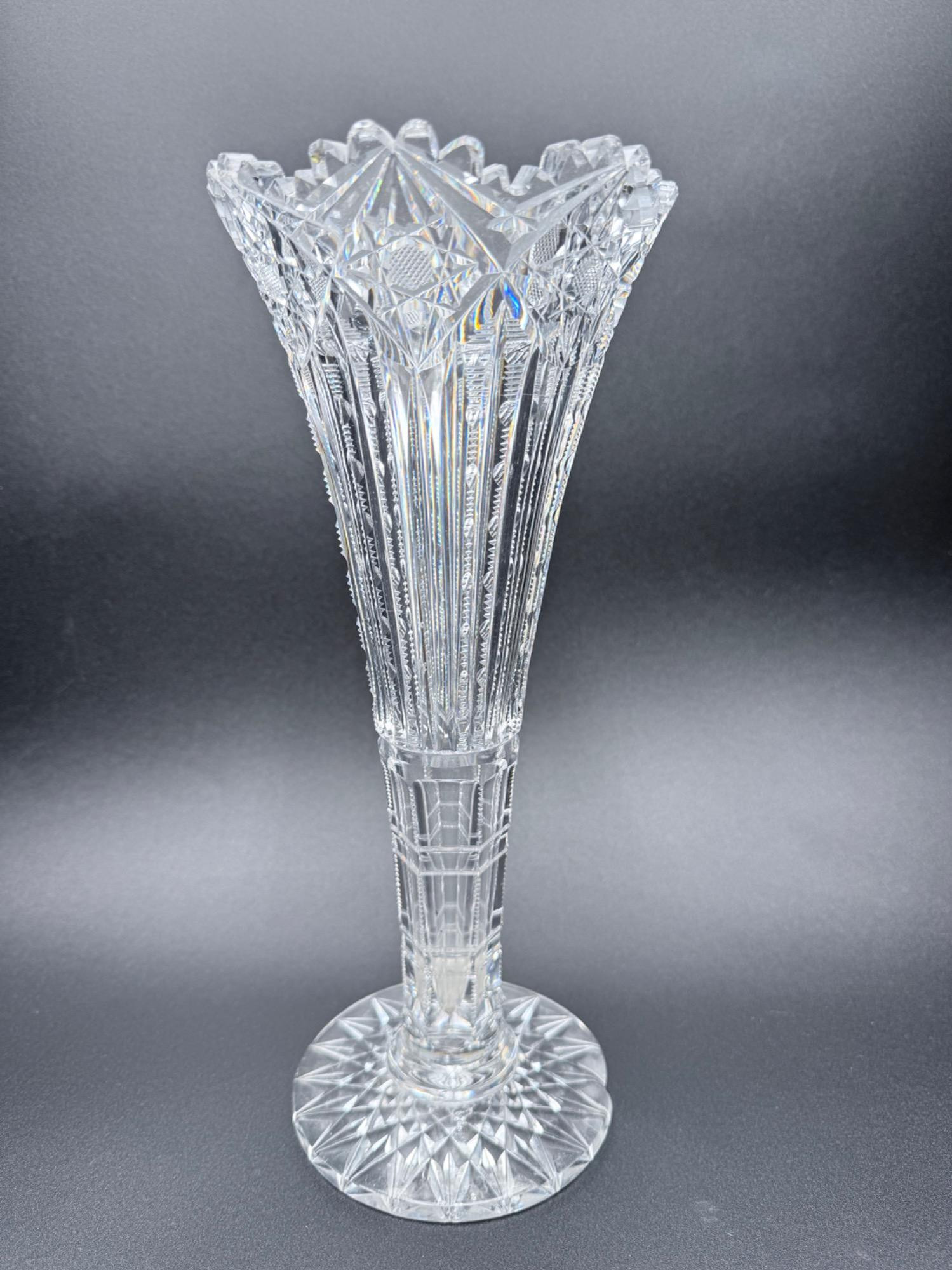 Timeless elegance meets brilliant craftsmanship in this stunning cut glass crystal vase, featuring dazzling clarity and deeply intricate designs. This piece boasts a flared rim adorned with alternating starburst and fan patterns, while the body showcases vertical cuts and geometric detailing that capture and reflect light beautifully from every angle. The scalloped rim and radiant base add a refined finish, making it a perfect centerpiece or collectible display item. The craftsmanship suggests high-quality pressed or cut glass, reminiscent of American Brilliant-style artistry.