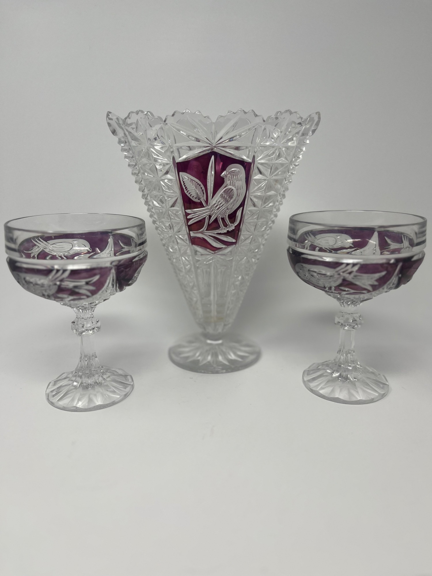 This elegant Hofbauer Byrdes crystal set includes a striking fan-shaped vase and two matching glasses, featuring the brand's signature cut-to-clear red glass design with intricately etched bird and foliage motifs. The vase showcases a starburst-cut base and a scalloped rim, enhancing its refined aesthetic. Dimensions: 9” tall x 7” wide (Vase), 5.5” tall x 4” wide (Glasses) Condition: Good vintage condition with no major flaws.