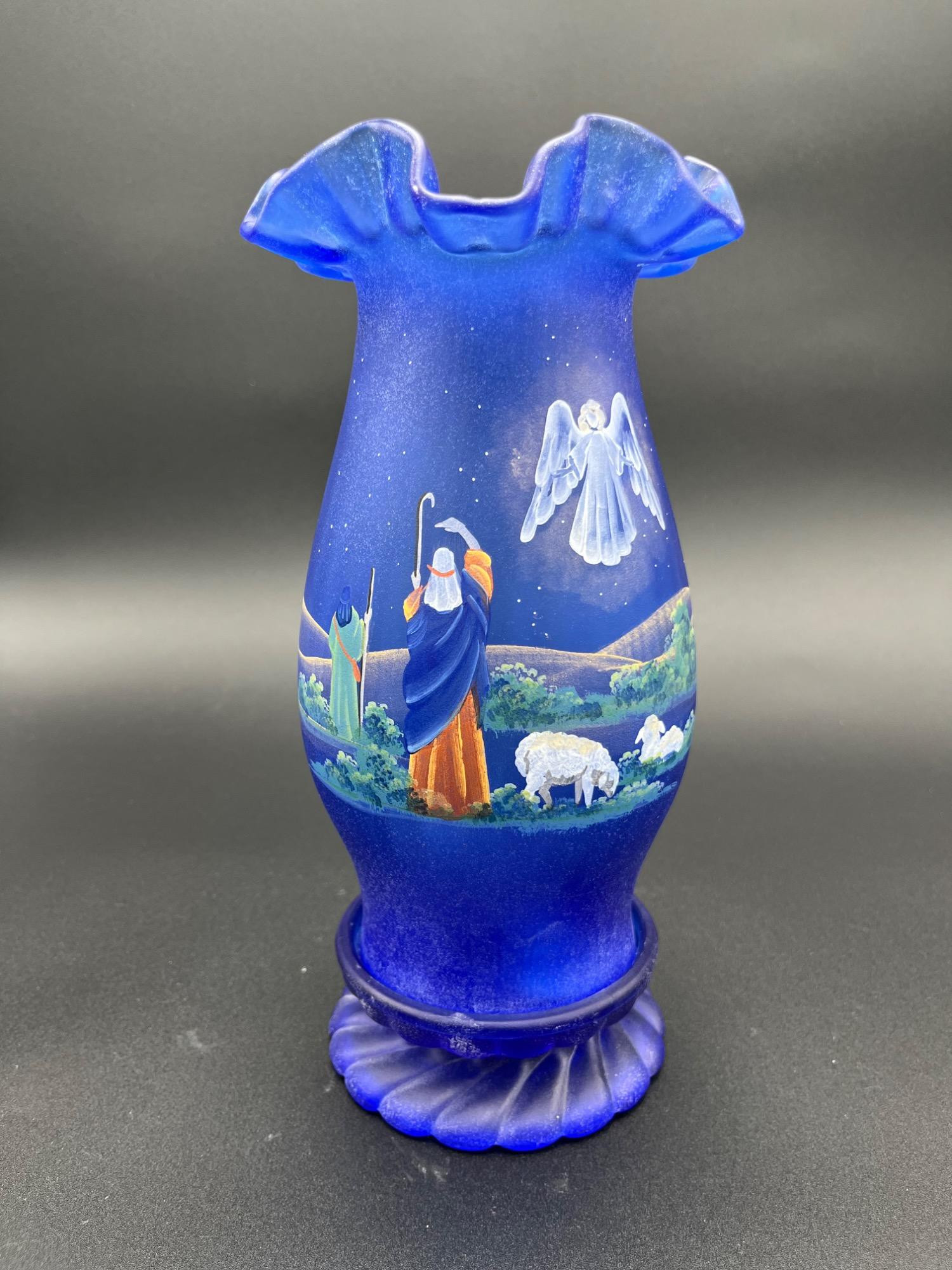 This stunning Fenton Art Glass vase showcases a beautifully hand-painted pastoral scene of sheep grazing beneath a starlit sky, set against a rich cobalt blue satin glass backdrop. The elegant ruffled rim and footed base enhance its classic silhouette. Features: Material: Satin-finished cobalt blue glass Design: Hand-painted pastoral scene with sheep and rolling hills under a starry night sky Artist: Signed by S. Bryan Limited Edition: #1047 of 1750 Maker: Fenton Art Glass – Handcrafted in the USA Markings: Embossed Fenton logo on base Dimensions (Approximate):W. 5" × T. 5.75" Condition: Well-preserved vintage condition.