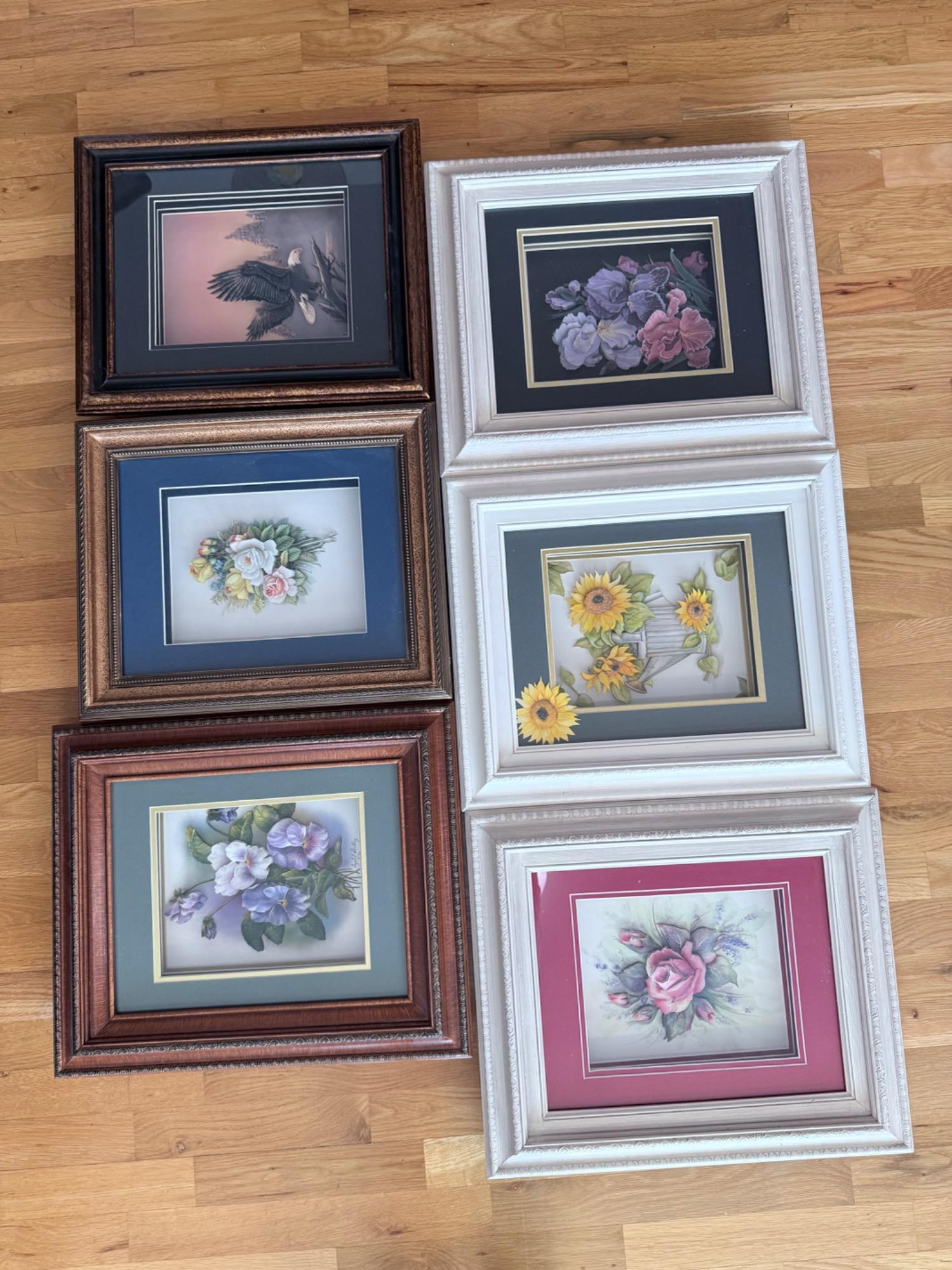 A beautiful collection of six framed 3D paper artworks, featuring intricate floral compositions and a striking bald eagle in flight. Each piece is crafted with layered paper techniques to create a dimensional effect, enclosed in elegant wood frames with coordinating matting. Includes: Eagle in Flight: A dramatic depiction of a bald eagle soaring over a misty landscape. Sunflowers in a Basket: A charming rustic scene with vibrant yellow sunflowers. Pink & White Roses: A delicate arrangement of roses in soft pastel hues. Purple & Blue Pansies: A lovely botanical study of layered petals. Iris Bouquet: A graceful floral artwork featuring detailed iris blooms. Pink Rose on Maroon Mat: A beautifully shaded rose with a watercolor-style background. Details: Quantity: 6 framed pieces Frame Material: Wood Dimensions: 19” x 16” (each) Art Type: 3D layered paper artwork Condition: Some minor wear on frames (refer to photos) No artist signature