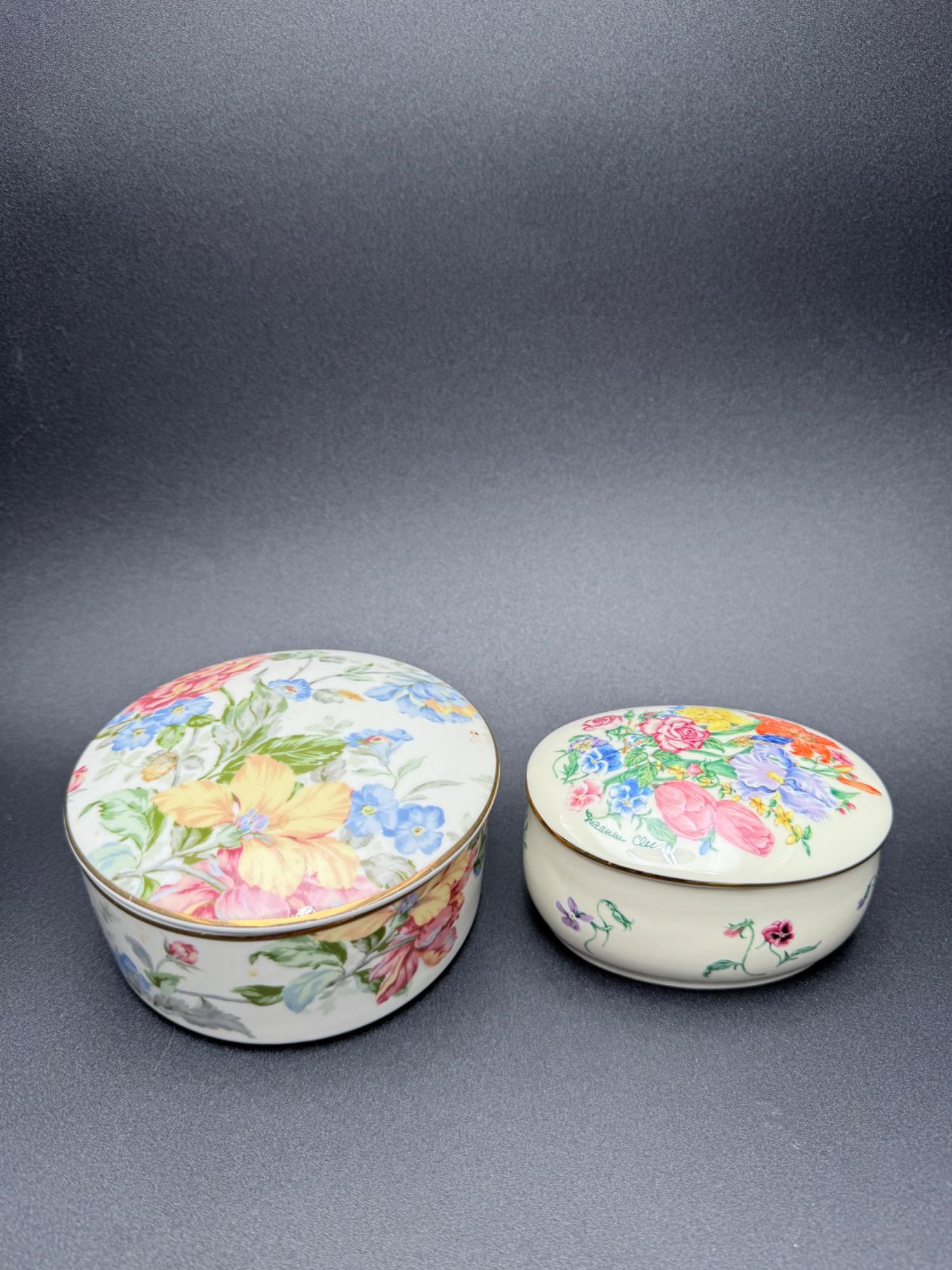 A beautiful set of two vintage porcelain boxes, each featuring elegant floral designs and fine craftsmanship. Mikasa English Tapestry Trinket Box (1983) Round porcelain box with a delicate multicolor floral pattern and gold rim. Marked "MIKASA English Tapestry UT008 1983 Japan." Measures approximately 2.5" tall and 5" wide. Lenox "The Flower Blossom" Music Box (1988) Oval porcelain music box with a vibrant floral motif and gold trim. Marked "The Flower Blossom Music Box by Suzanne Clee, Lenox Fine Porcelain, 1988, Handcrafted in Malaysia." Measures approximately 2.5" tall and 4.5" wide. Condition: Both boxes are in excellent condition with no visible chips, cracks, or repairs.