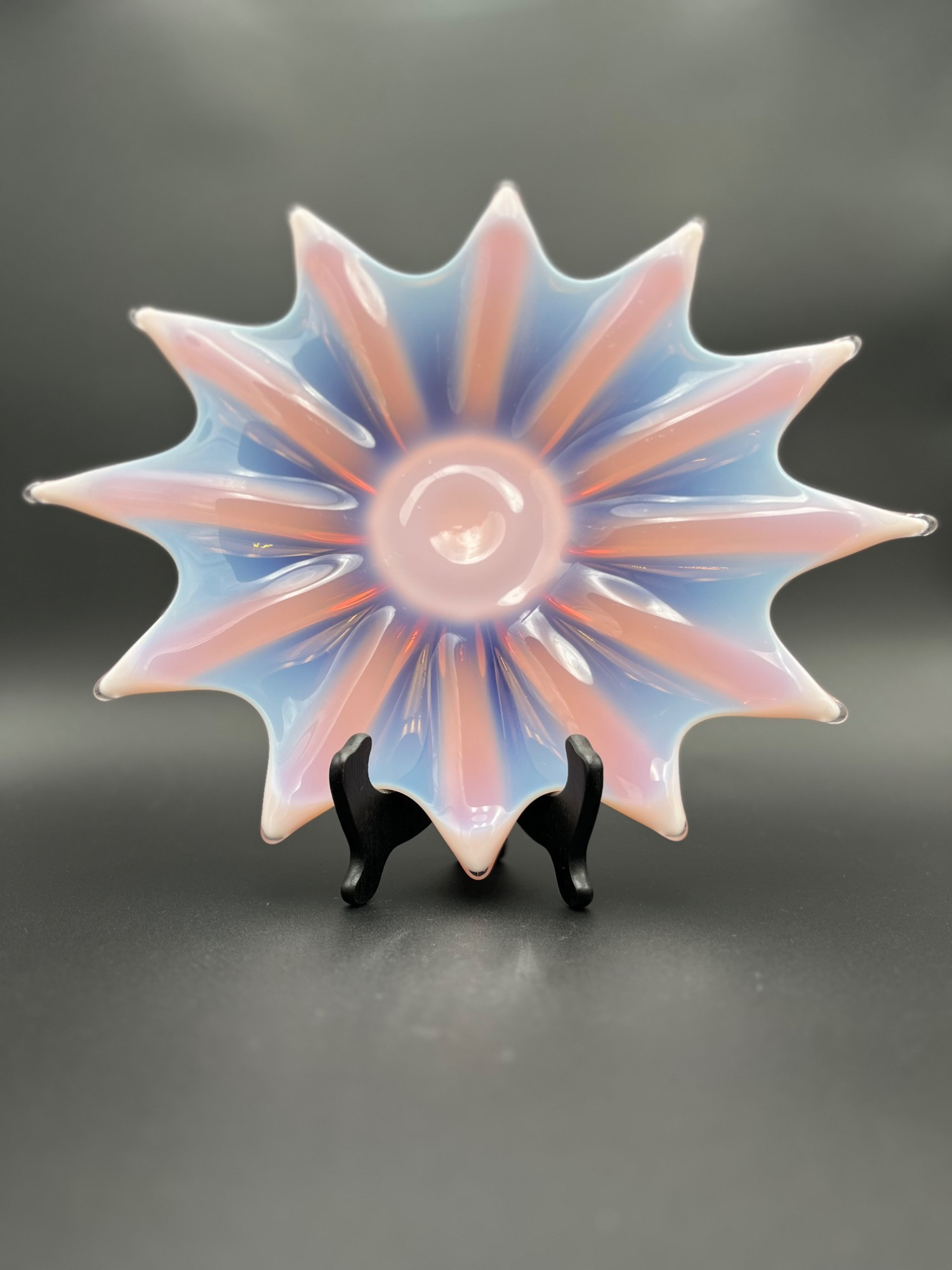 This stunning opalescent art glass starburst dish features a vibrant blend of soft pink and blue hues, creating an elegant and eye-catching display. Designed with a striking starburst-like floral shape, this handcrafted piece showcases intricate glasswork with gracefully extended petals. Dimensions: 2” Tall x 17” Wide Condition: Well-preserved with no visible chips or cracks.