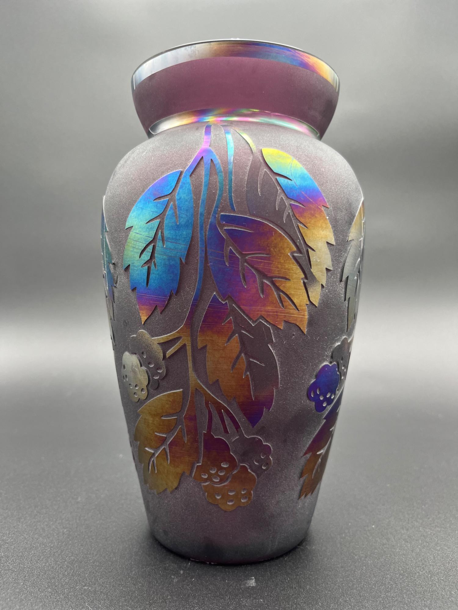 This stunning Fenton Art Glass Vase, "Leaves of Gold" designed by Martha Reynolds, features a rich dark purple (amethyst) hue with a striking iridescent finish. Sand Carved leaves. The hand-etched berry and leaf motif shimmers with blue, gold, and green tones, creating a captivating visual effect. Details: Maker: Fenton Designer: Martha Reynolds Color: Dark purple with iridescent sheen Pattern: Etched berry and leaf design Size: Approximately 9.25 inches tall x 5 inches at widest point Markings: Etched signature on the base: “Fenton, designed by Martha Reynolds" 59/950 Condition: Some surface residue on the base, but the artwork and structure remain intact.