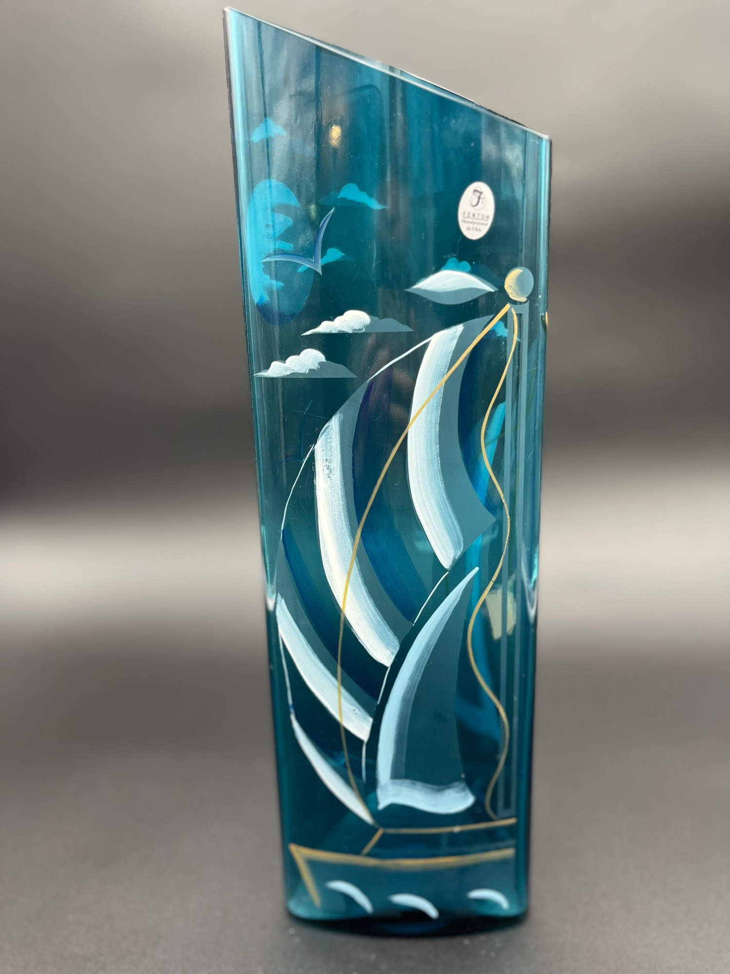 This Fenton Handcrafted art glass vase features a striking deep blue hue with a beautifully hand-painted sailboat scene, accented with white, gold, and light blue detailing. The asymmetrical design, with a slanted top, adds a contemporary touch to this collectible piece. Maker: Fenton (Handpainted in the USA, retains original label) Design: Nautical-themed sailboat, clouds, and seagull Color: Deep blue with white and gold accents Size: Approx. 16" tall x 5" wide Condition: Well-preserved with no visible chips, cracks, or repairs.