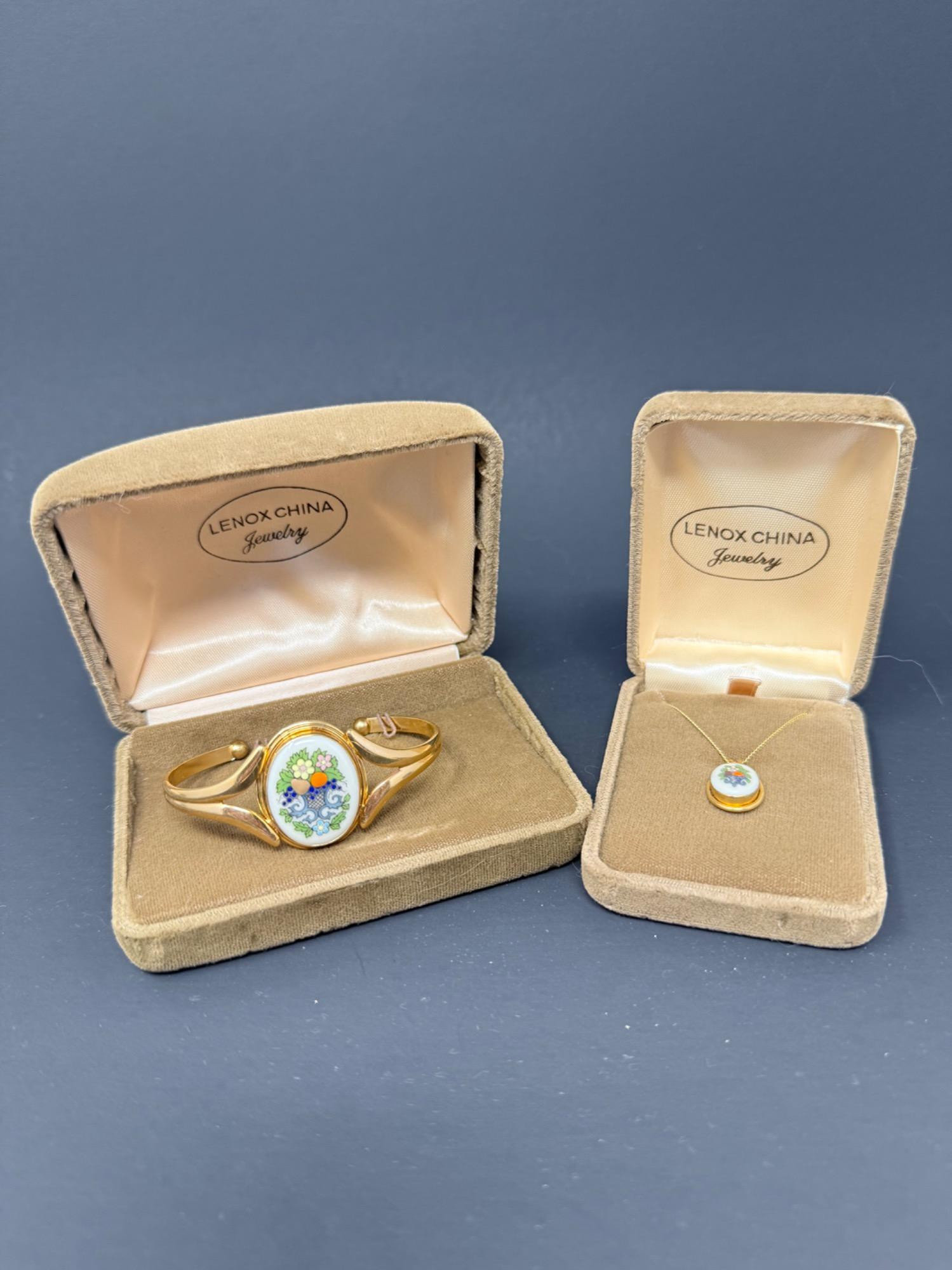 Add timeless elegance to your jewelry collection with this exquisite vintage Lenox China "Autumn Petite" bracelet and pendant necklace set. Featuring delicate hand-painted porcelain designs set in gold-tone metal, this matching set showcases a charming fruit and floral motif with intricate detailing, perfect for vintage jewelry enthusiasts and collectors. Features: Authentic Lenox China Jewelry – Known for high-quality porcelain craftsmanship Condition: Great vintage condition with minor wear.