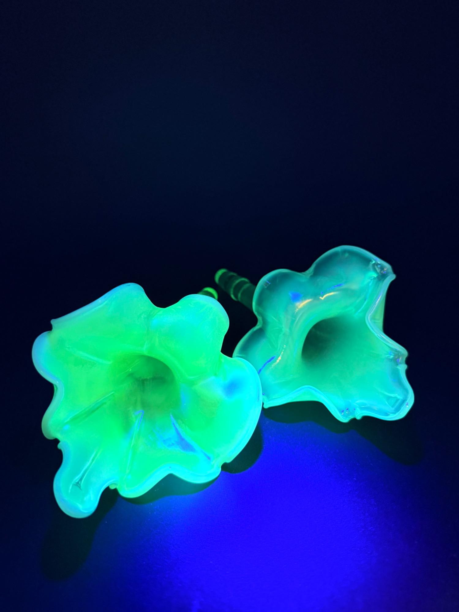 Fenton Canary Vaseline Lily Yellow Epergne- two lilies. These set of two Fenton Canary Vaseline has uranium and glows under UV light. They are iridescent and the tops of the lilies are opalescent. No chips or no cracks have been found on the pieces. Glows under UV light. Dimensions: 9" x 4.5" wide