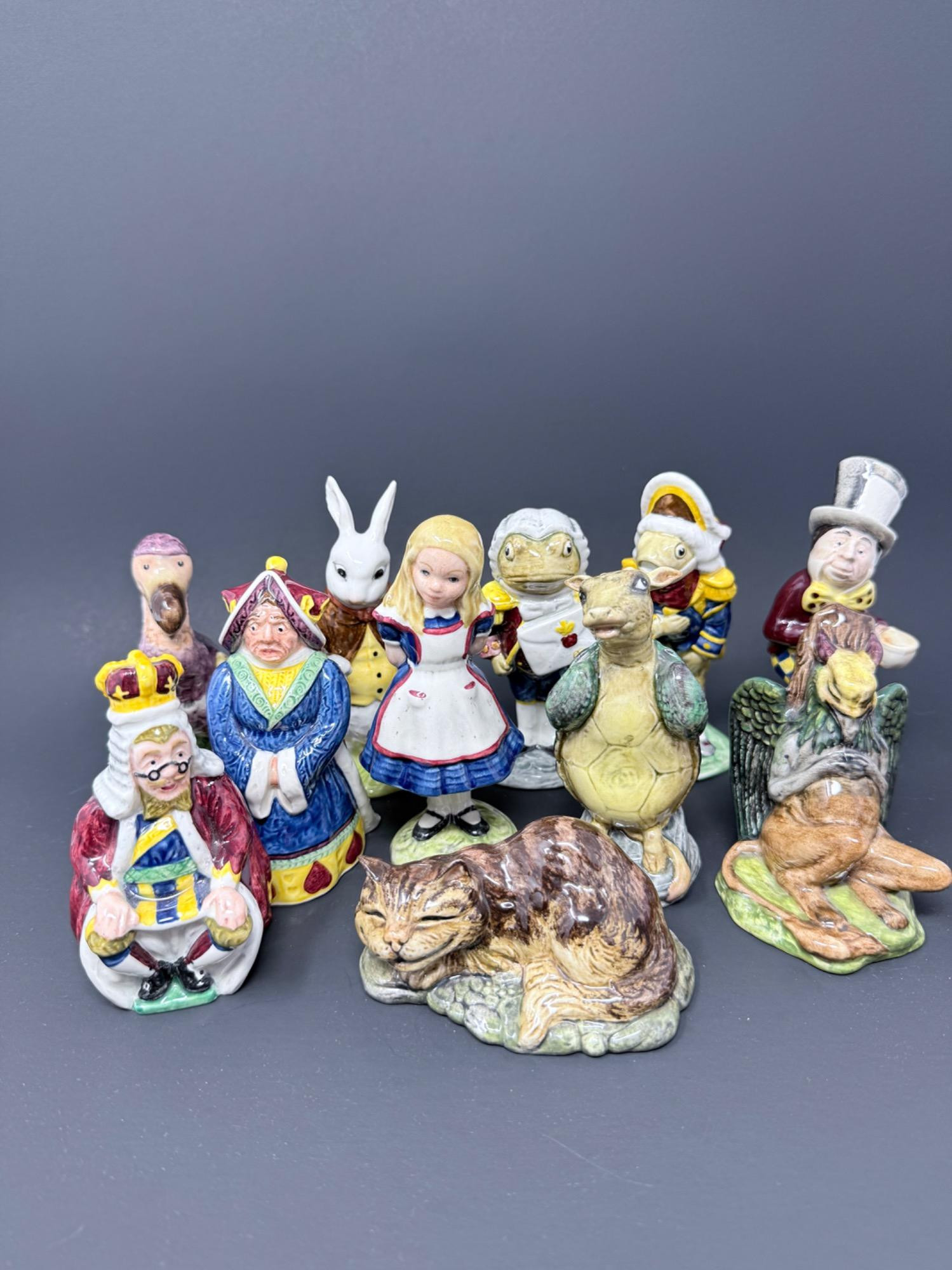 A RARE complete set from the 1974 Beswick Alice in Wonderland Series, crafted by Royal Doulton. Featuring Lewis Carroll’s beloved characters, each figurine is hand-painted, stamped, and made in England. A true collector’s dream and a timeless treasure for fans of classic literature and fine ceramics. This highly collectible set includes: Alice White Rabbit Mad Hatter Queen of Hearts King of Hearts Cheshire Cat Dodo Gryphon Mock Turtle Various Wonderland characters Condition: Excellent condition with fine detailing.