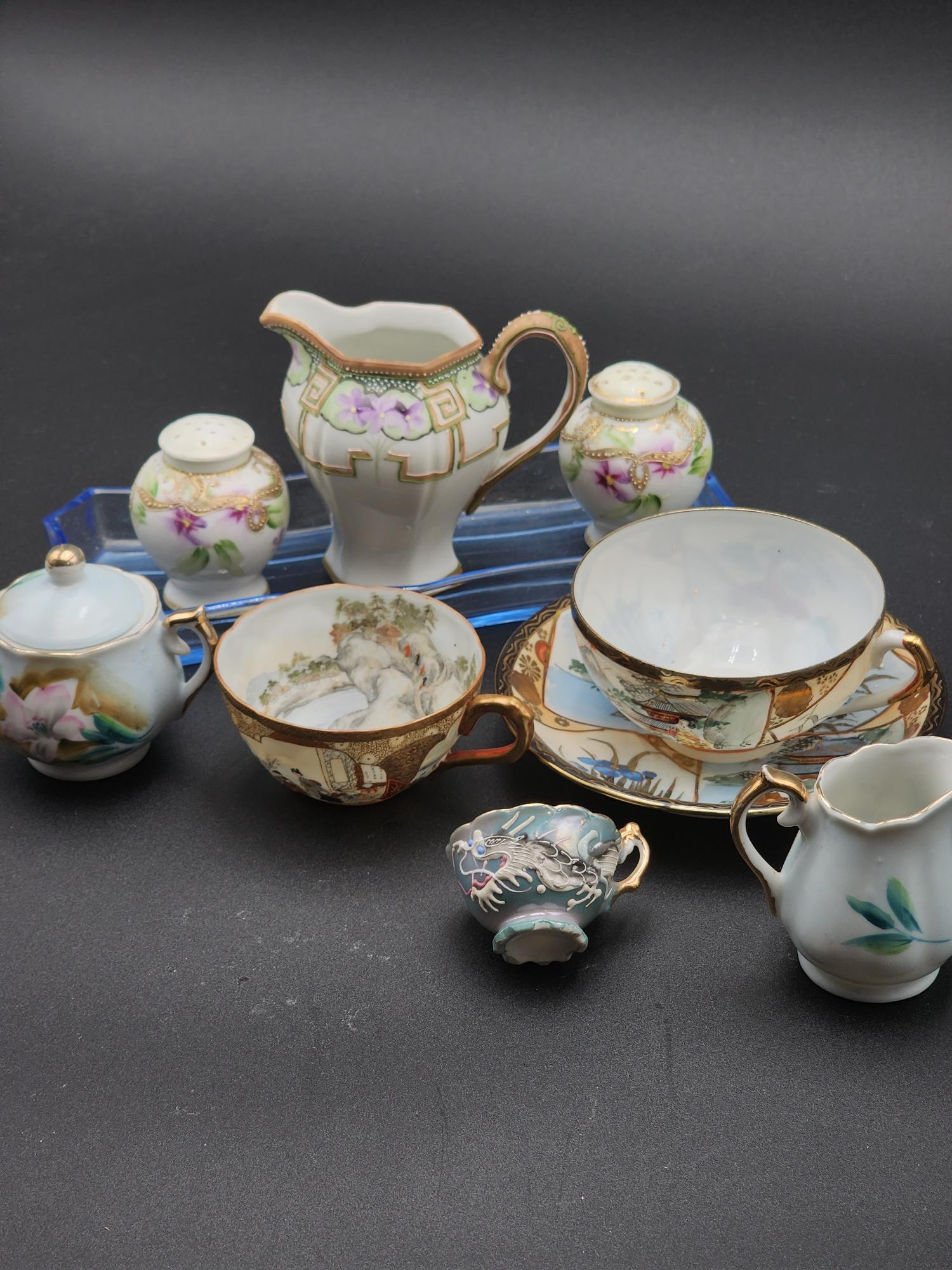 This exquisite antique Japanese tea set features beautifully hand-painted Nippon porcelain, dating back to the early 1900s. Marked with the “Hand Painted Nippon” back stamp, these pieces were crafted before 1921, showcasing the fine artistry of Japanese export porcelain. Set Includes: Teacups & Saucers – Delicately painted with scenic landscapes, floral motifs, and gilded rims. Creamer & Sugar Bowl – Soft pastel floral designs with gold trim. Salt & Pepper Shakers – Matching hand-painted floral accents with gold embellishments. Rare Moriage Dragon Cup – Featuring raised relief dragon design, a hallmark of Japanese moriage craftsmanship. Key Features: Hand-Painted Porcelain – Intricate details with traditional Japanese scenery, florals, and gold accents Condition: Some signs of age-appropriate wear, but overall in excellent vintage condition. No visible cracks or major chips. Please refer to photos for details.